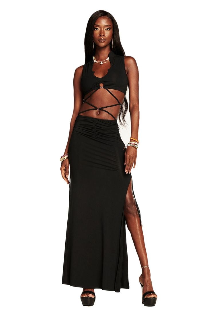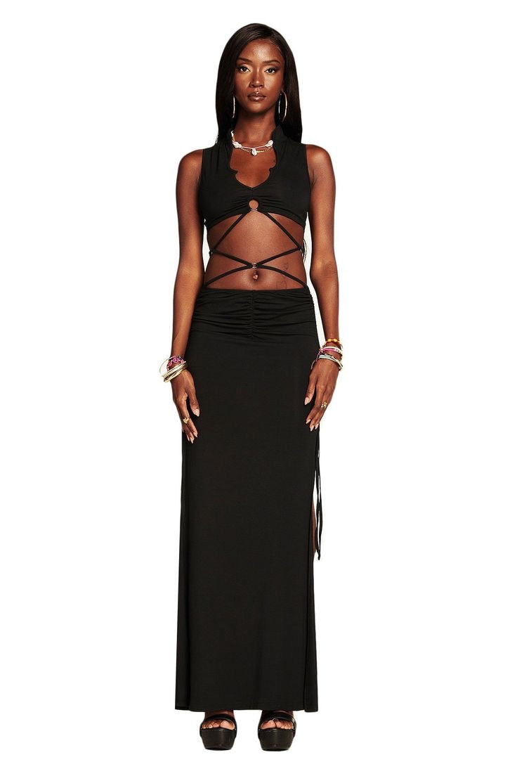 Robe longue noire avec détails de bretelles au niveau du torse, fronces en V à la taille, douce