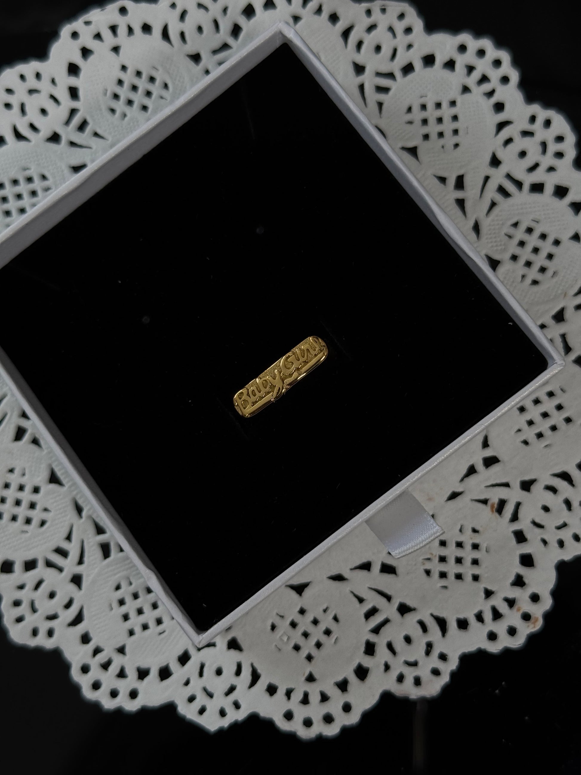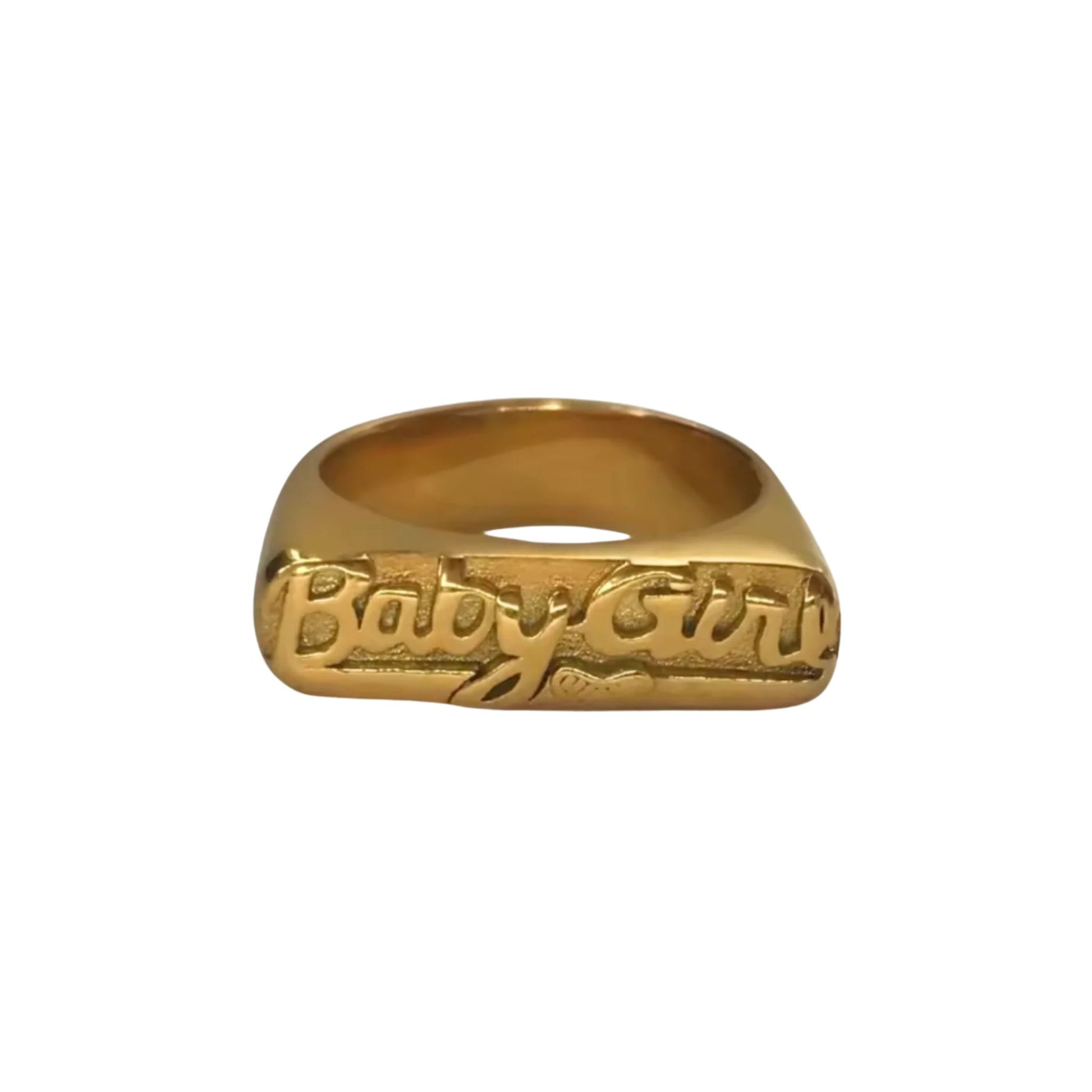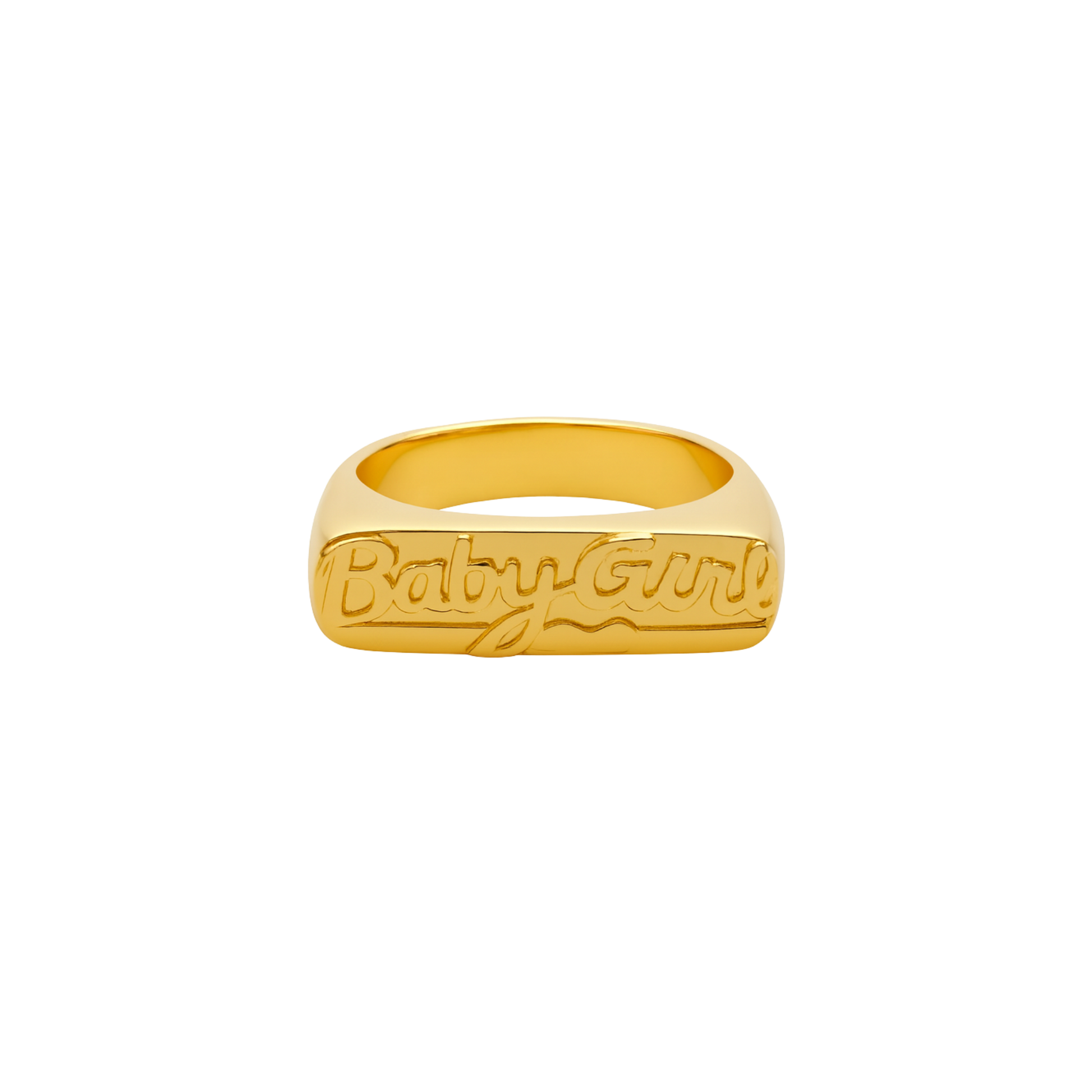 Affirmez-le haut et fort, portez-le fièrement. Notre bague « Baby Girl » est un clin d'œil audacieux à l'énergie négative des années 2000 : imposante, brillante et incontournable. Dotée d'un élégant anneau carré orné de l'inscription « Baby Girl » en relief et plaquée or 18 carats, cette pièce d'exception est faite pour faire tourner les têtes et susciter les conversations. Résistante à l'eau, anti-ternissement et hypoallergénique, ce n'est pas un simple bijou, c'est une personnalité.