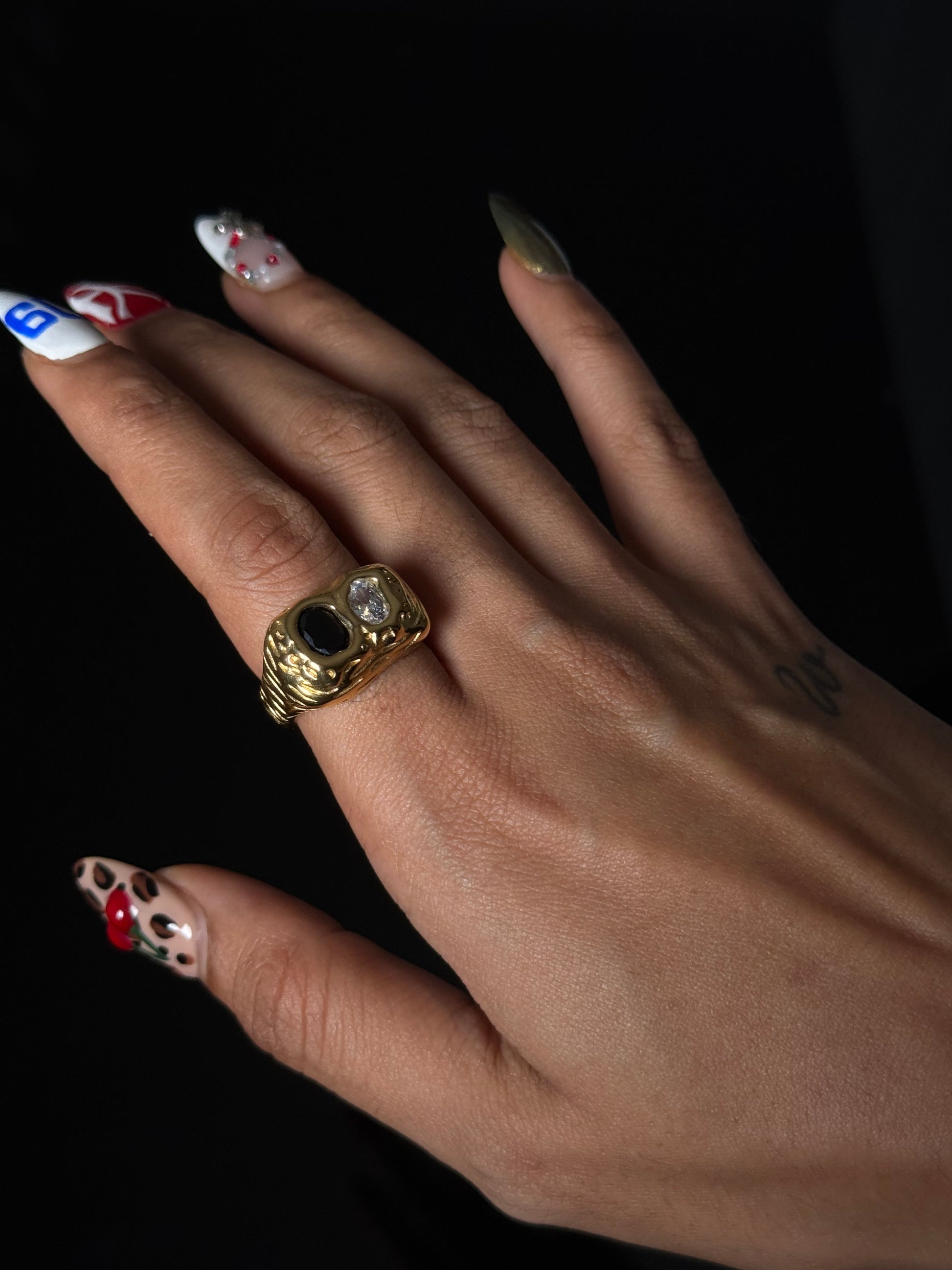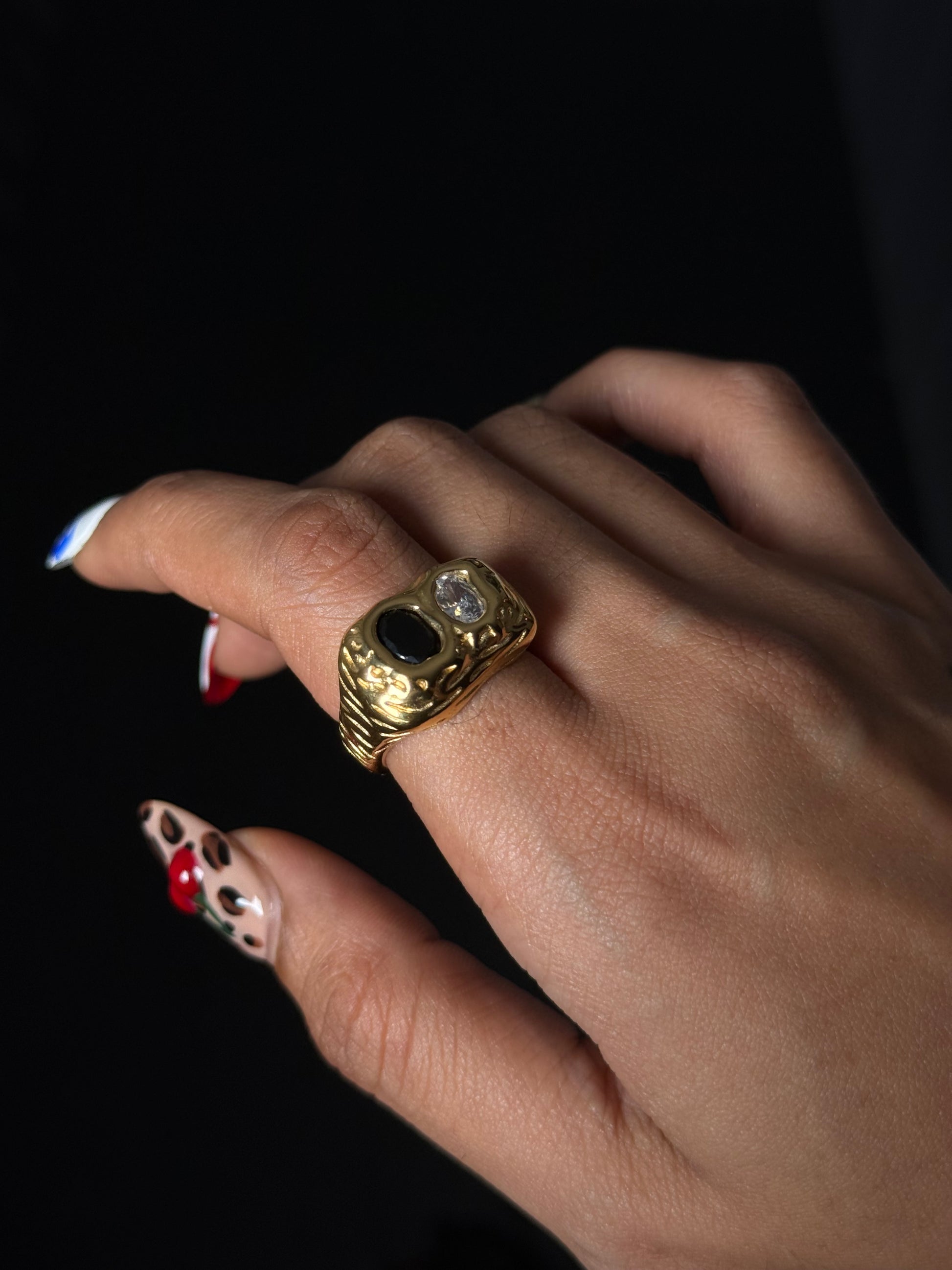 Confectionnée en or 18 carats avec une finition organique et très épaisse, cette bague est faite pour se démarquer. Deux pierres éblouissantes – une opale noire mystérieuse et une pierre transparente étincelante – sont serties au cœur de l'or, capturant la lumière (et l'attention) sous tous les angles.