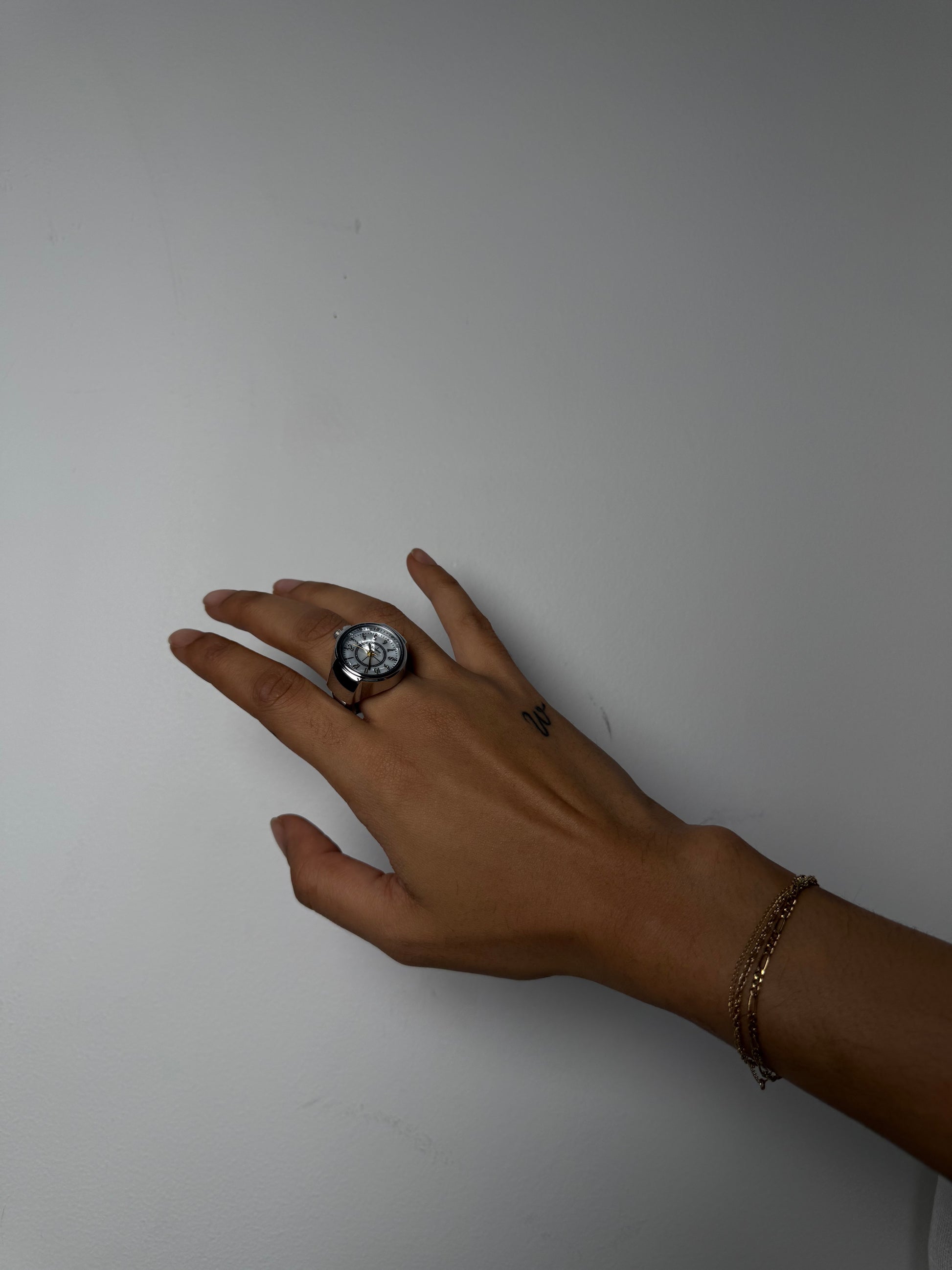 Dotée d'un bracelet en titane, elle est légère, durable et partiellement étanche pour un usage quotidien. Que vous l'associaisiez à vos bagues préférées ou que vous la laissiez briller seule, la bague Tempo apporte précision, sophistication et une touche d'énergie à votre collection de bijoux.