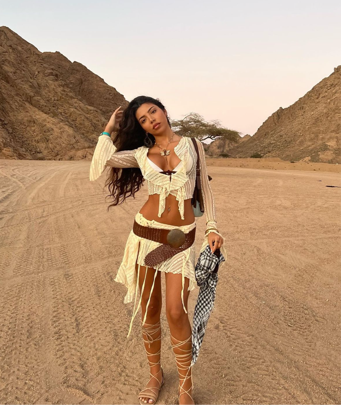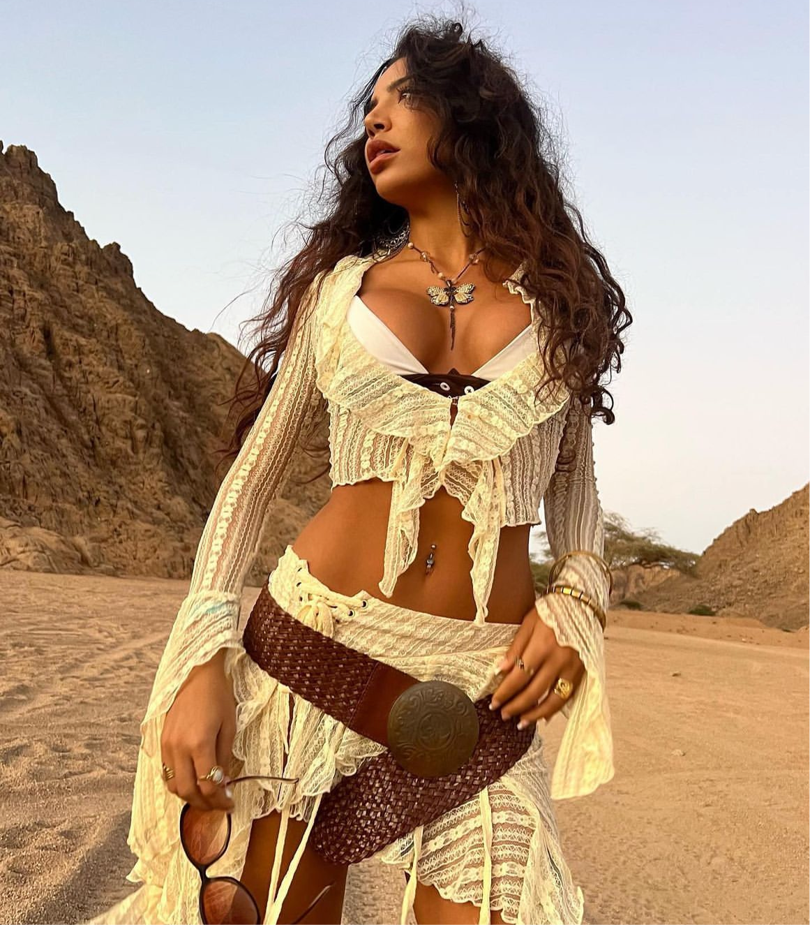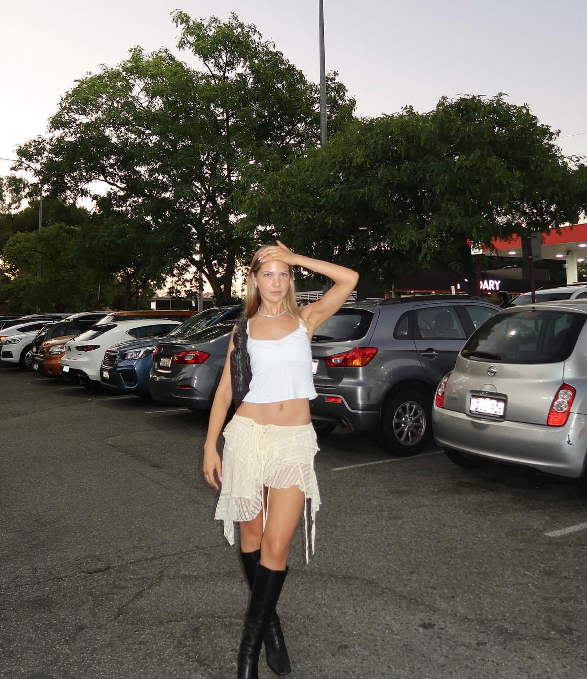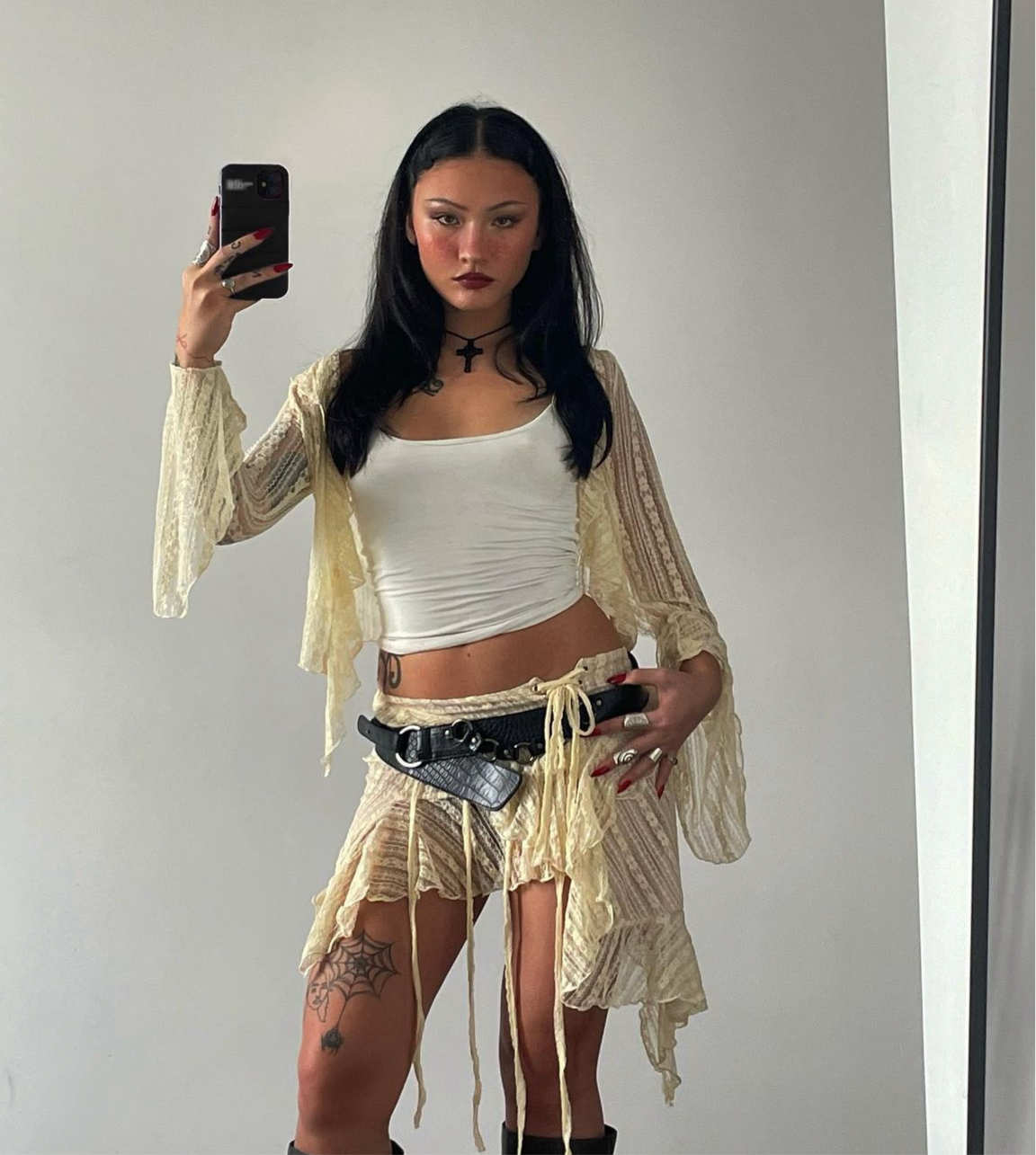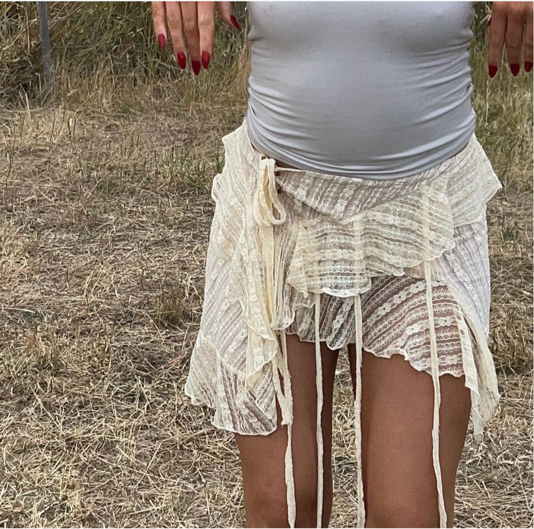 このスカートには調節可能なサイドタイが付いており、お好みの位置に着けることができます。