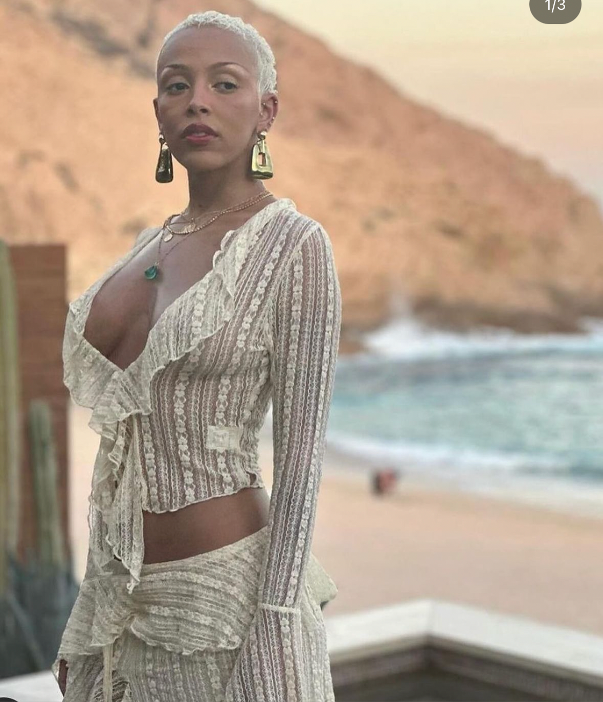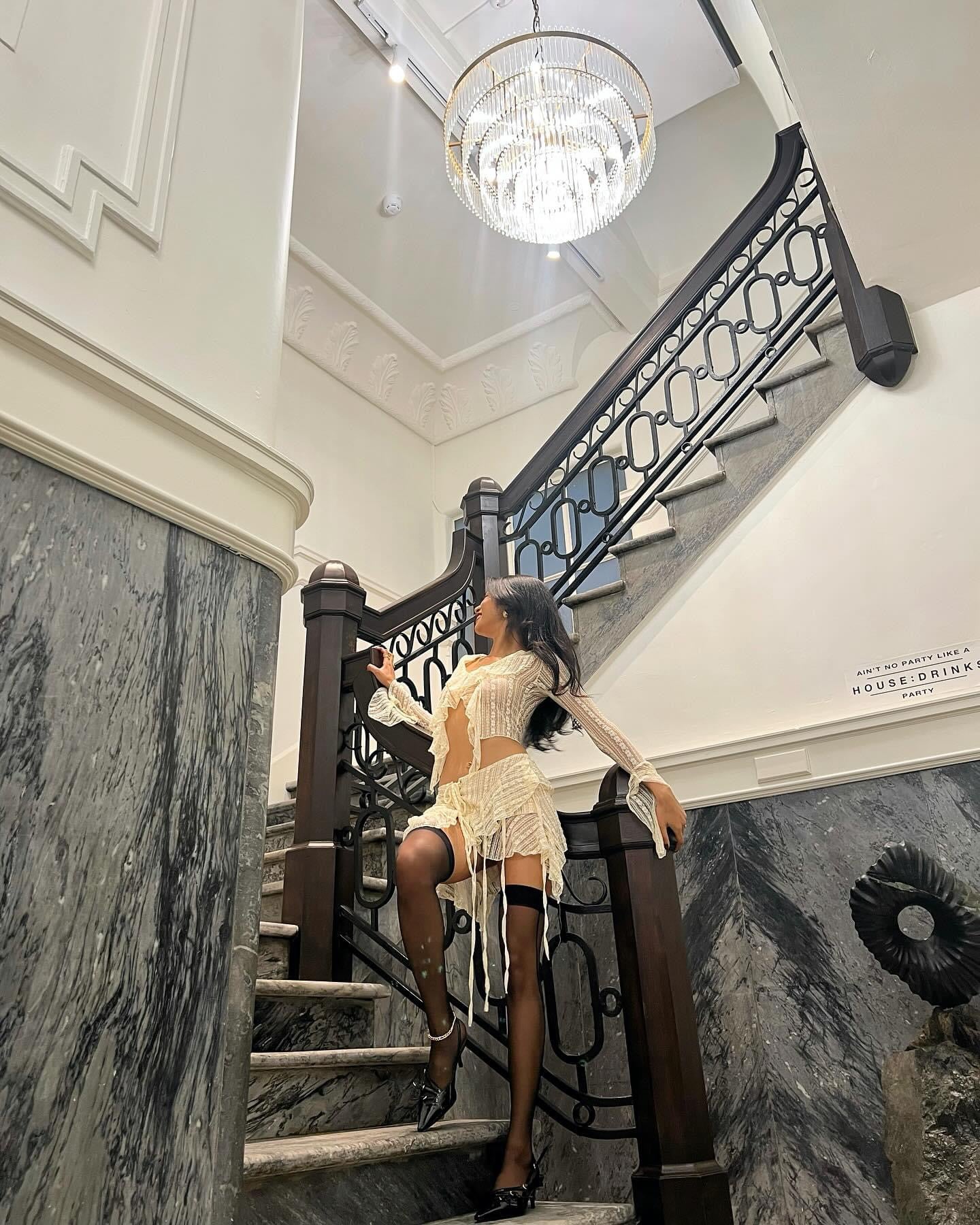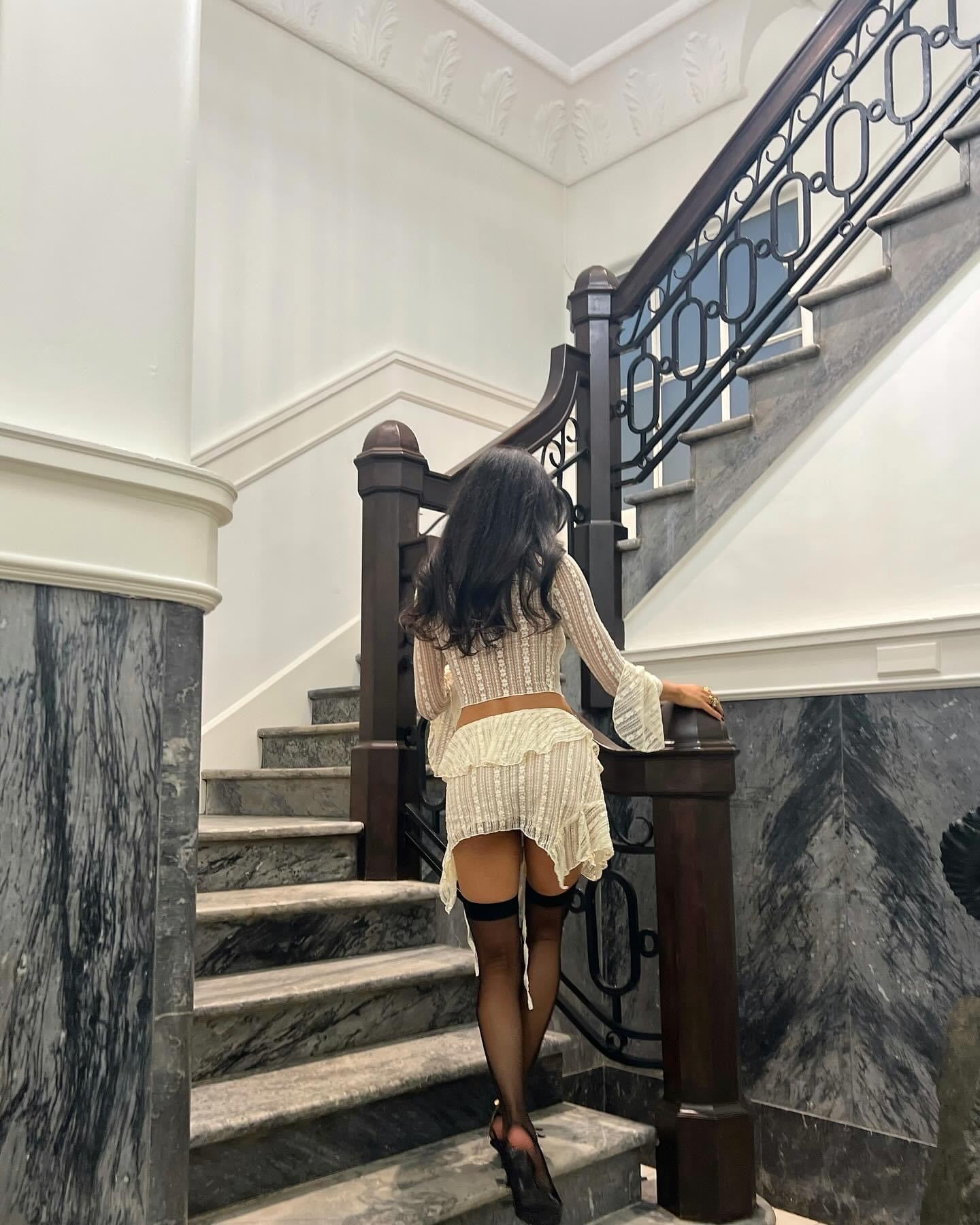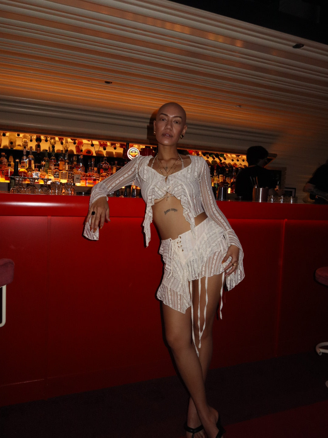 このスカートには調節可能なサイドタイが付いており、お好みの位置に着けることができます。