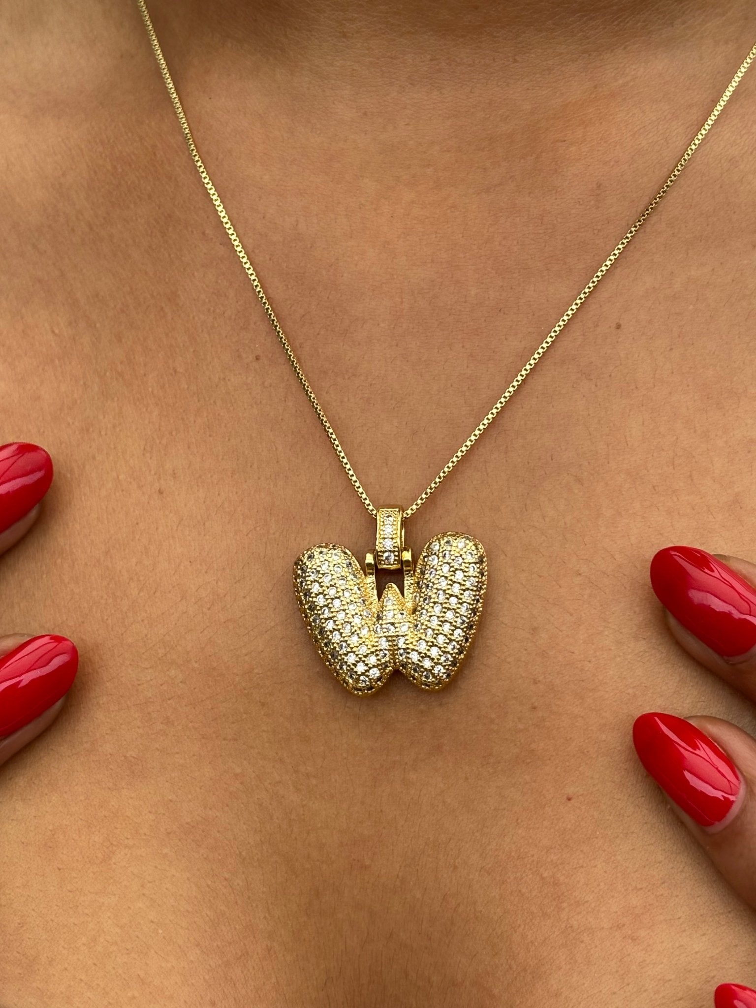 ゴールドバブルネックレスで個性をアピール!遊び心のあるバブルフォントに、カスタムメイドの18金メッキステンレススチール製キュービックジルコニウムペンダントをあしらった、魅力的な逸品です。