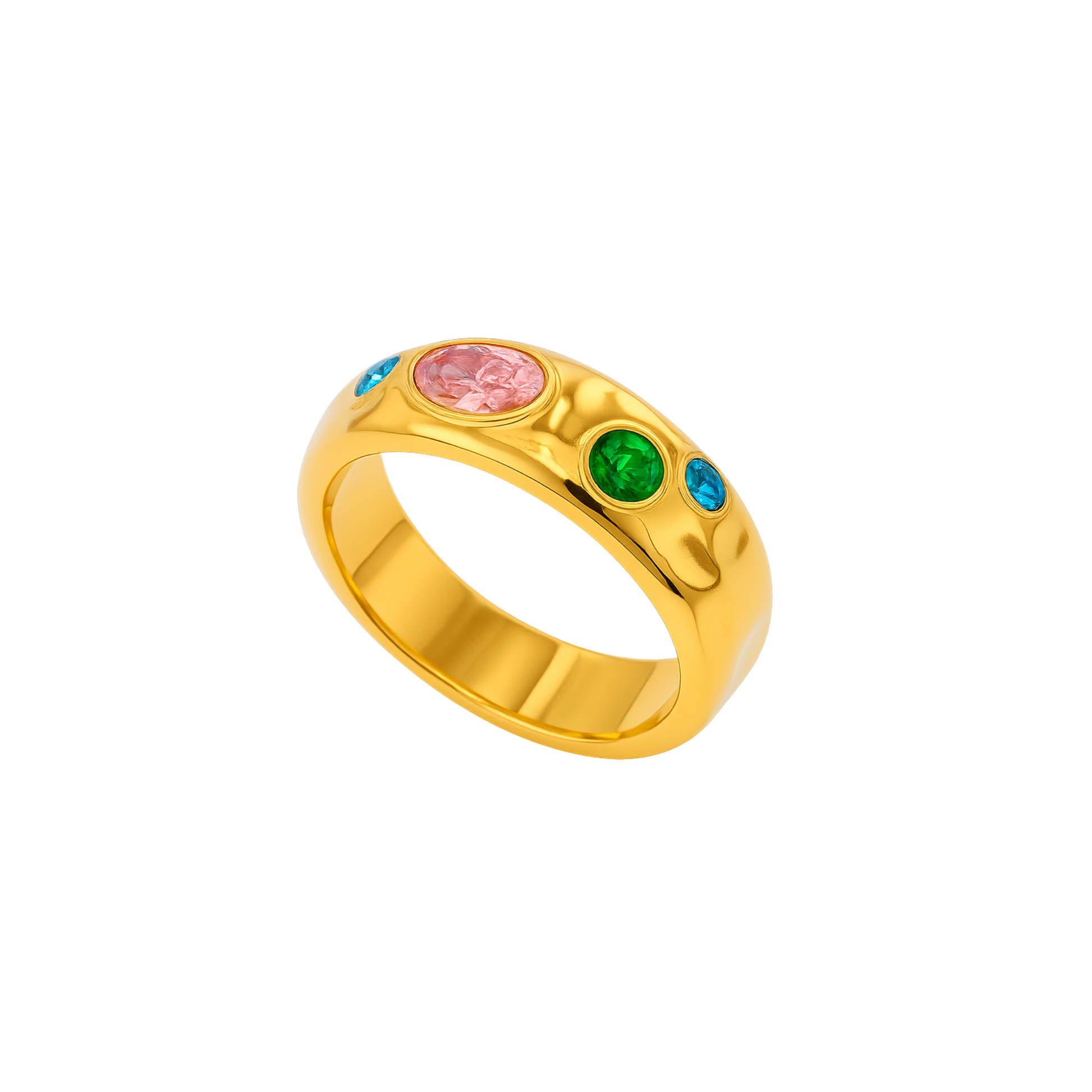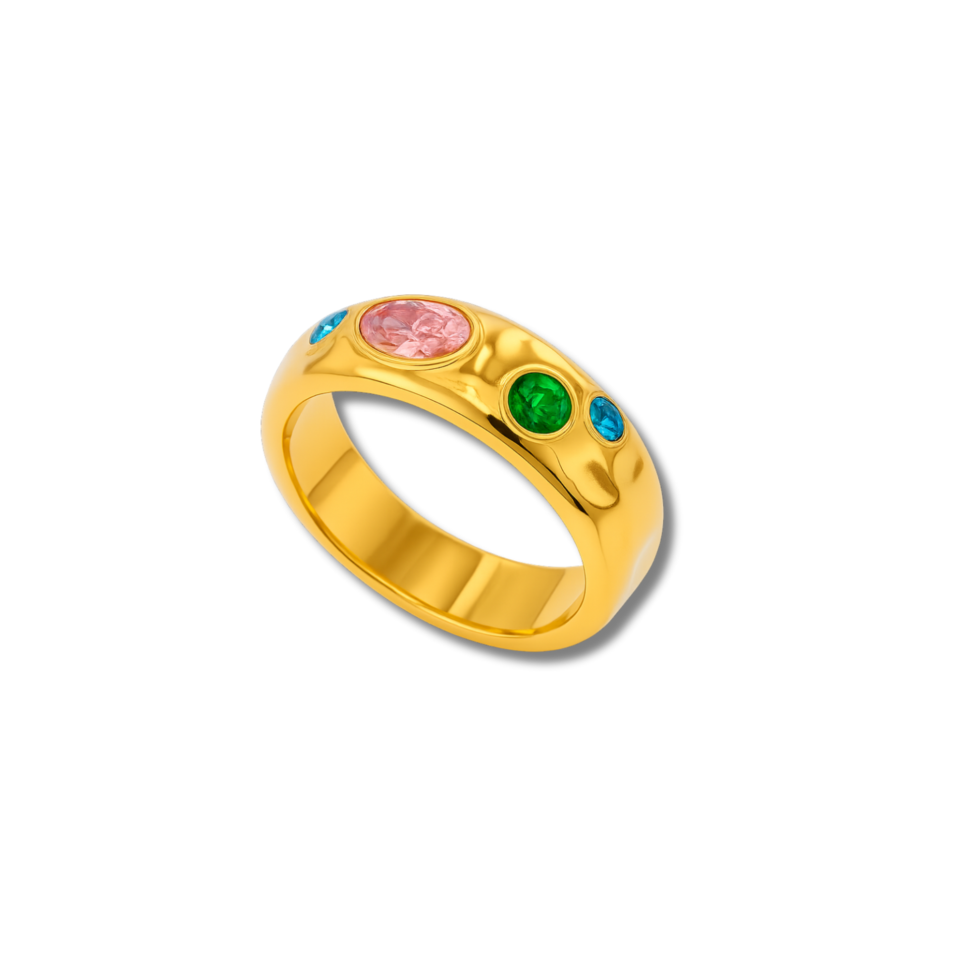 コンフェッティ リングは、楽しさとラグジュアリーが融合した究極のリングです。18Kゴールドメッキのステンレススチールに、あらゆる角度から光を捉える鮮やかなマルチカラーの宝石を散りばめています。まるで、虹色の紙吹雪を散りばめたジュエリーのように、大胆で明るく、きっとあなたを笑顔にしてくれるでしょう。