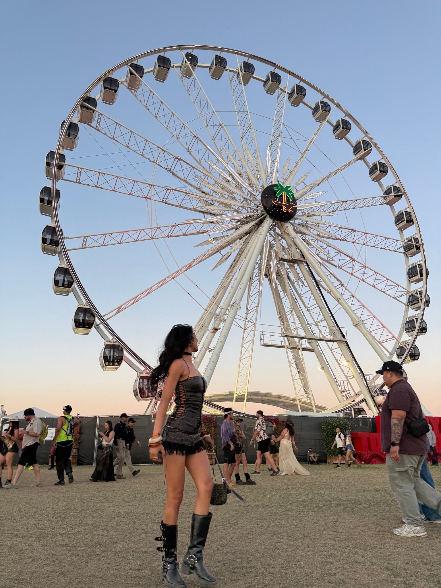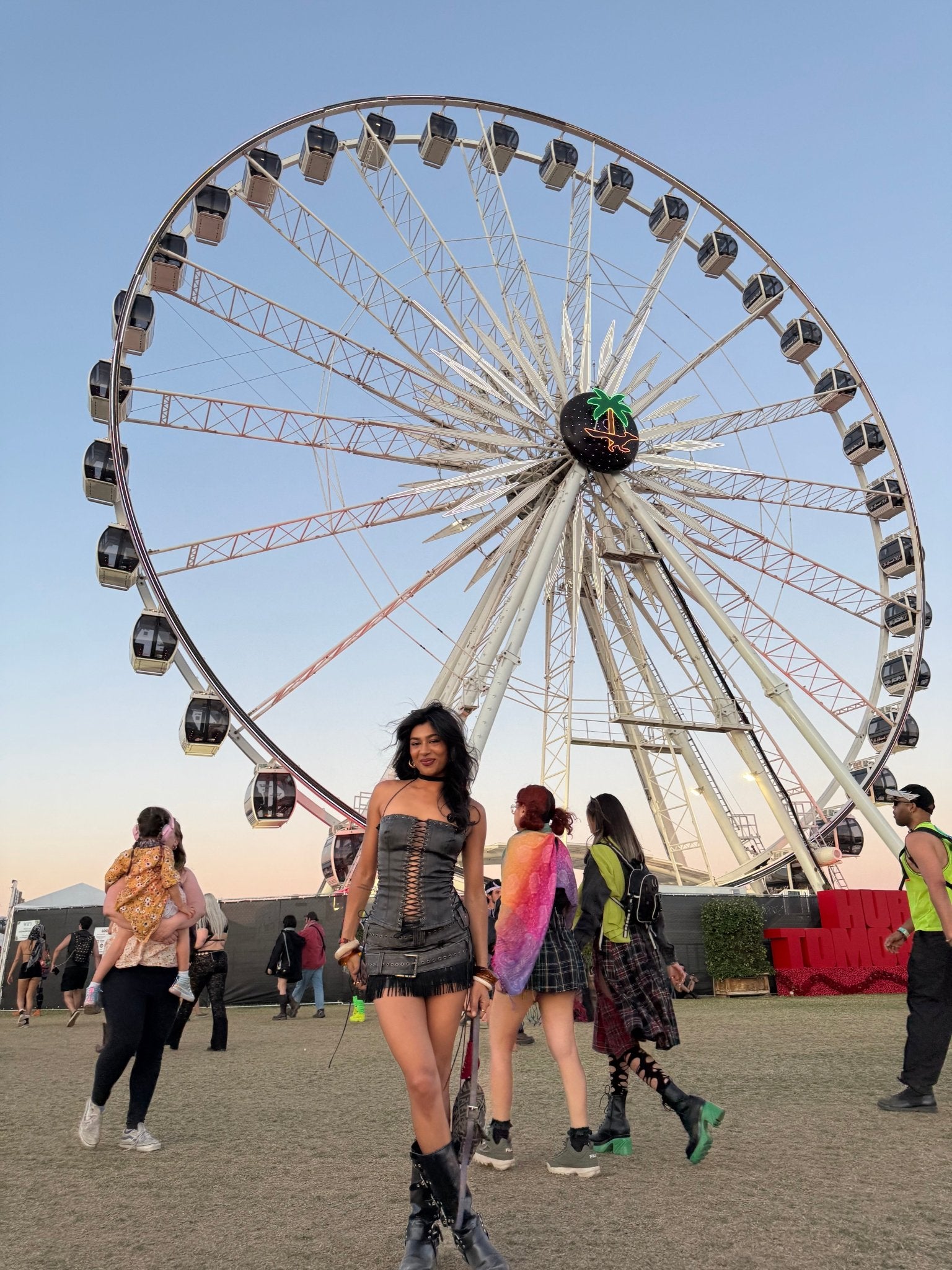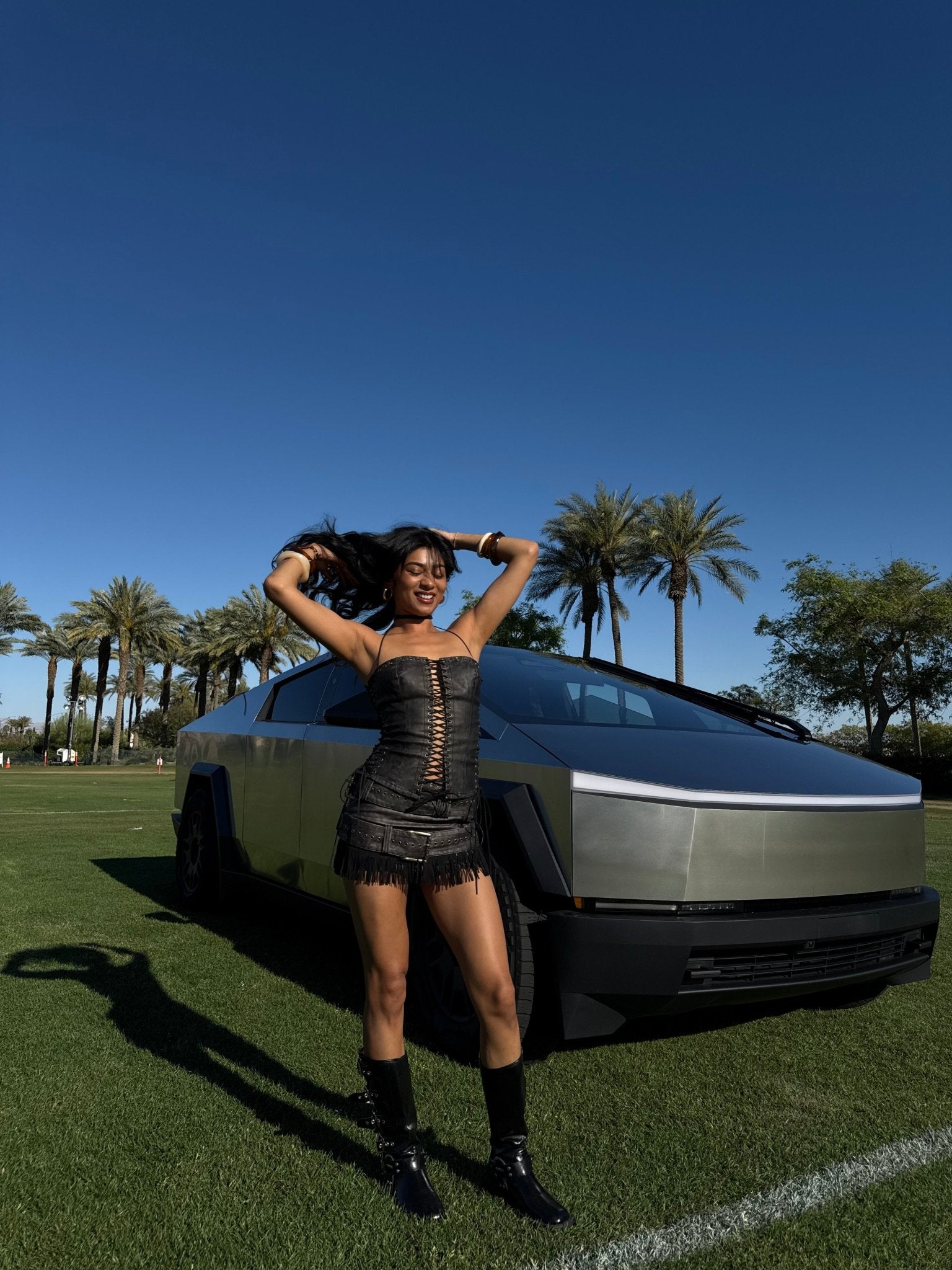 アイレットとレースアップのディテールが特徴的な、ウォッシュ加工のフェイクレザーを使用したロング丈ホルターネックコルセット。ベルトディテールとフェイクスエードのフリンジが特徴的なフェイクレザーのミニスカートと合わせました。