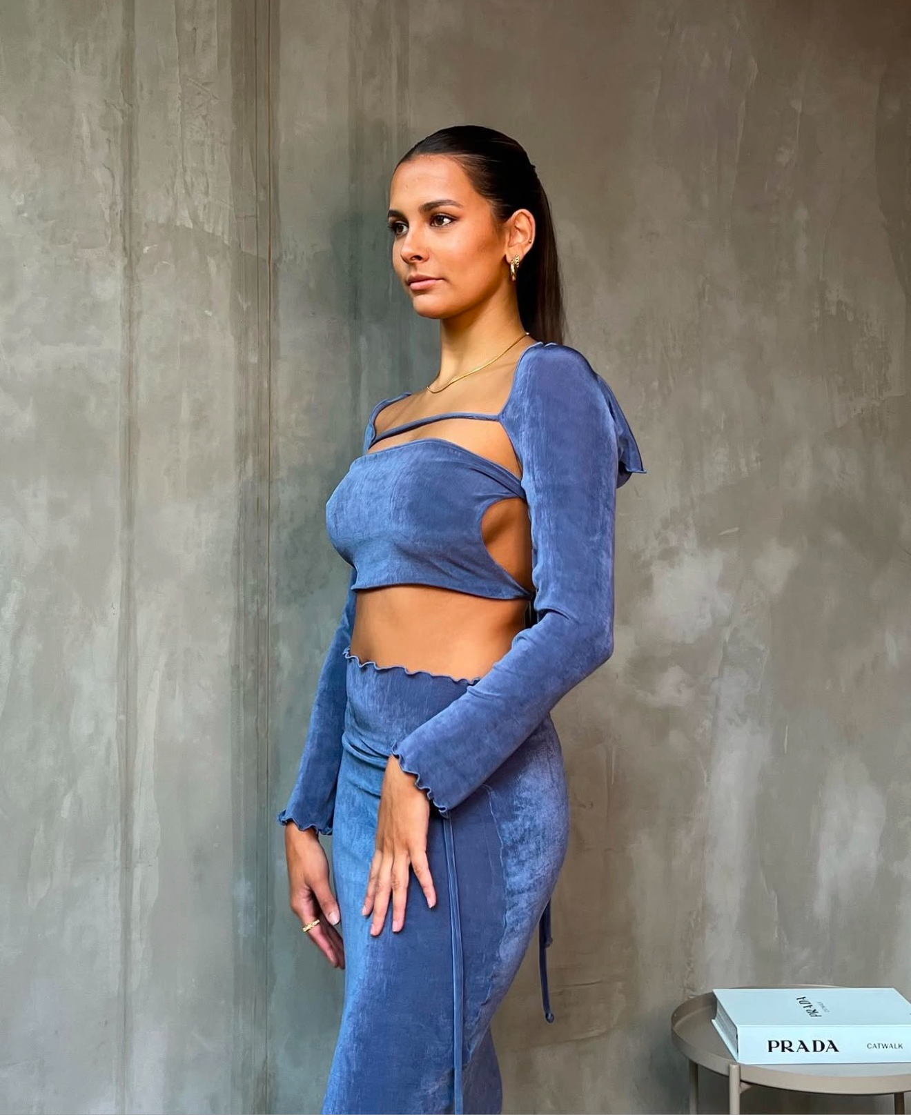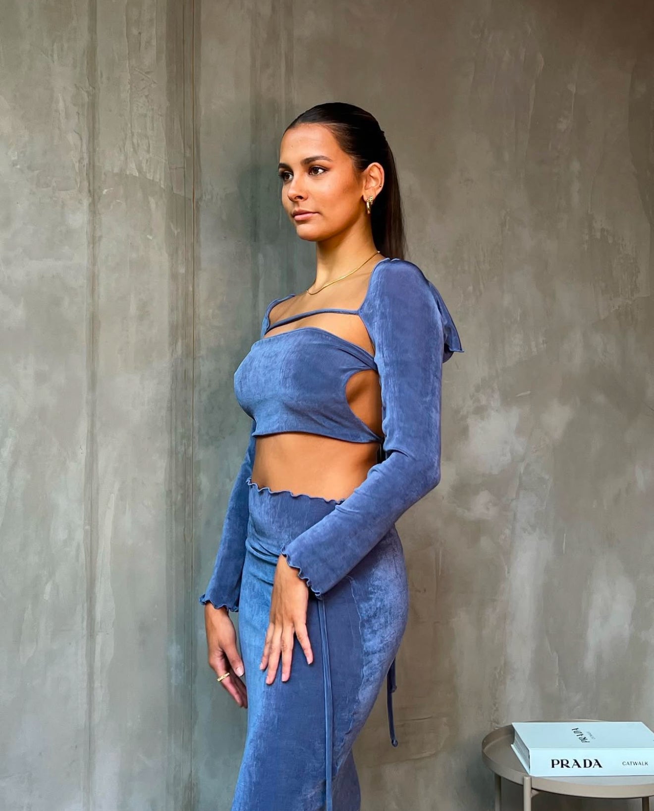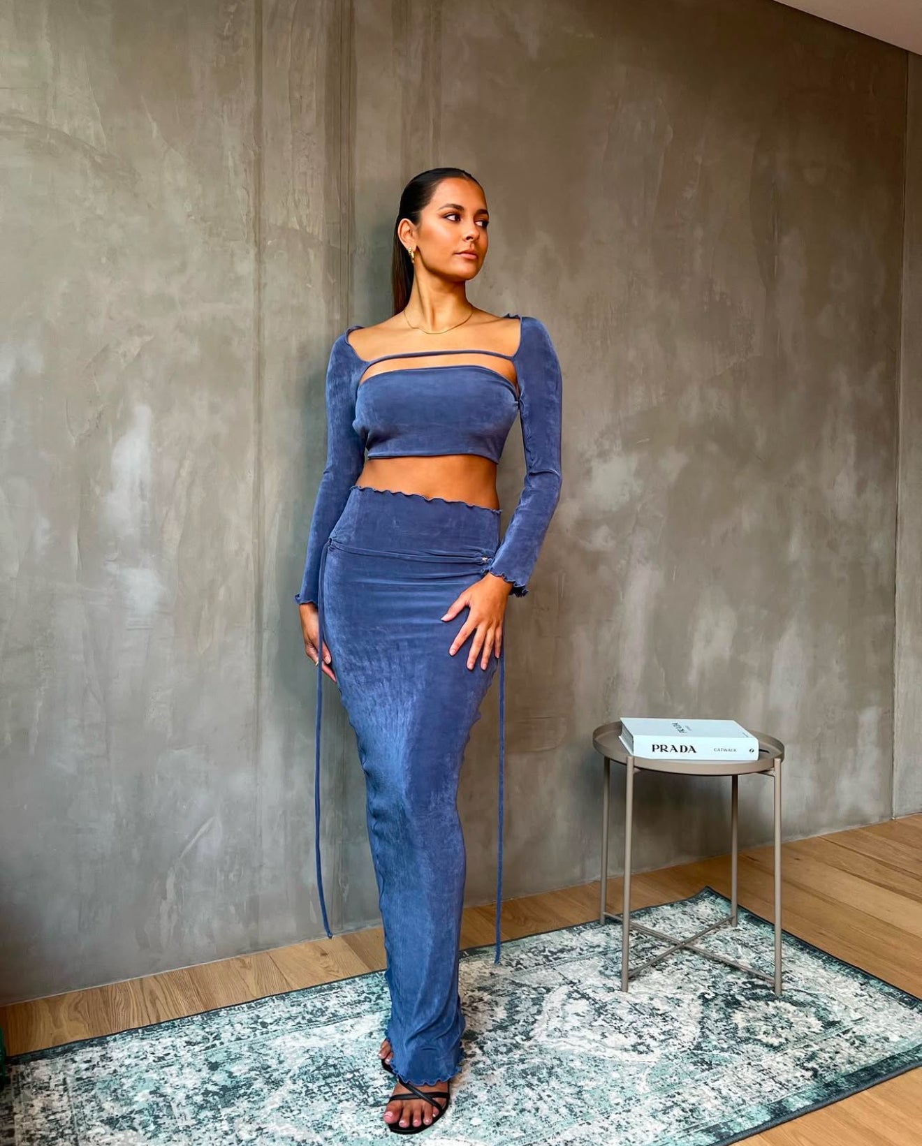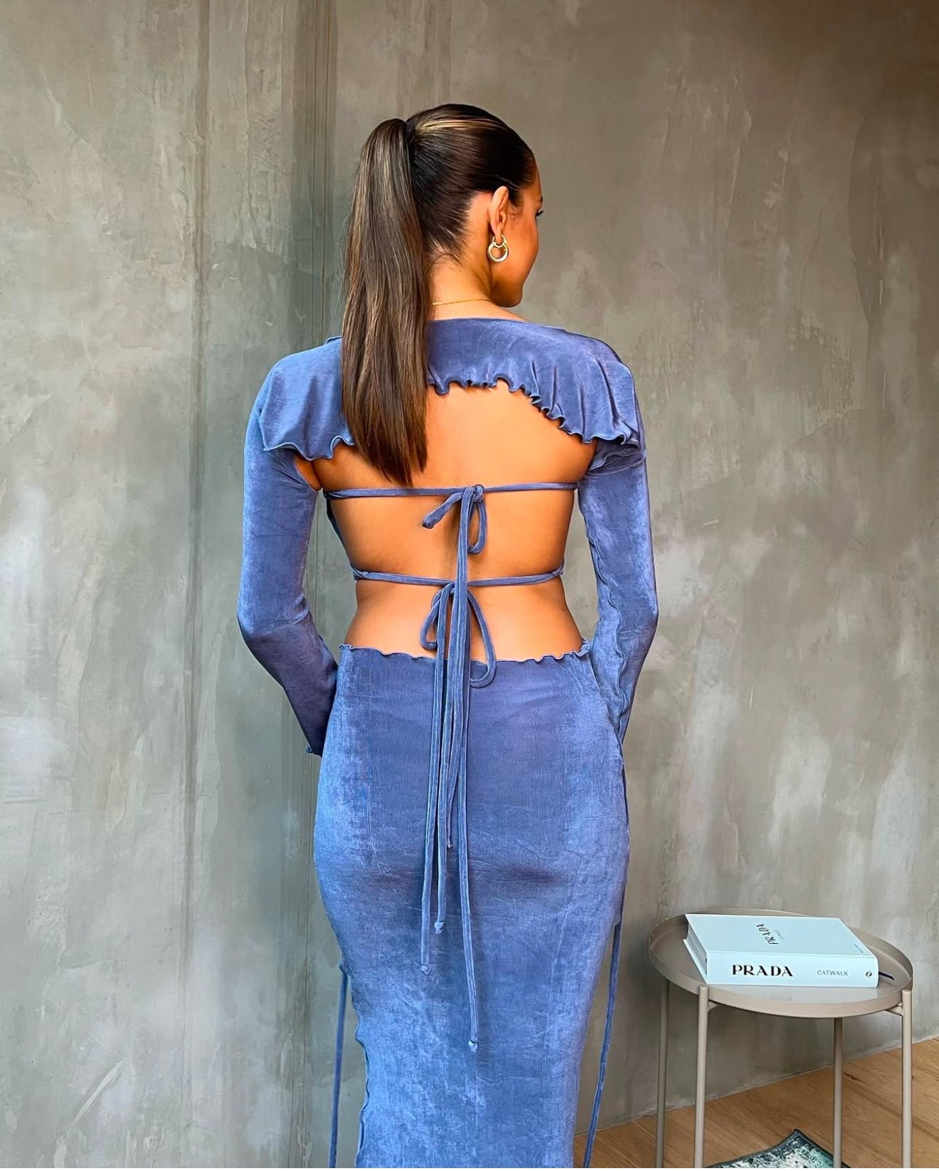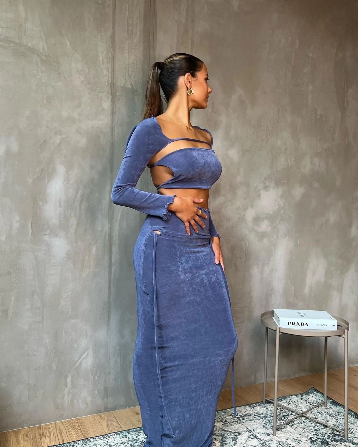 ホルターネック、オイスタースリーブ、ブルーのマキシスカートが特徴です