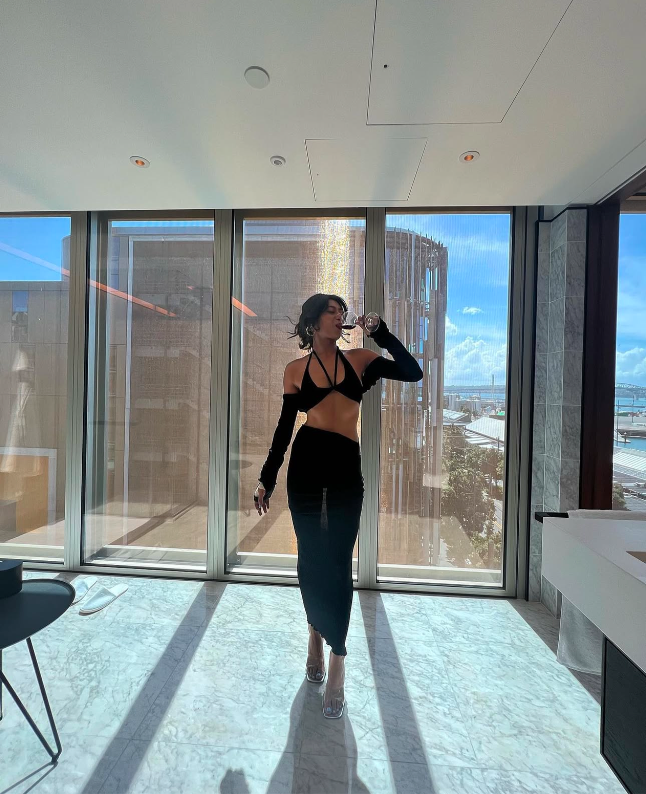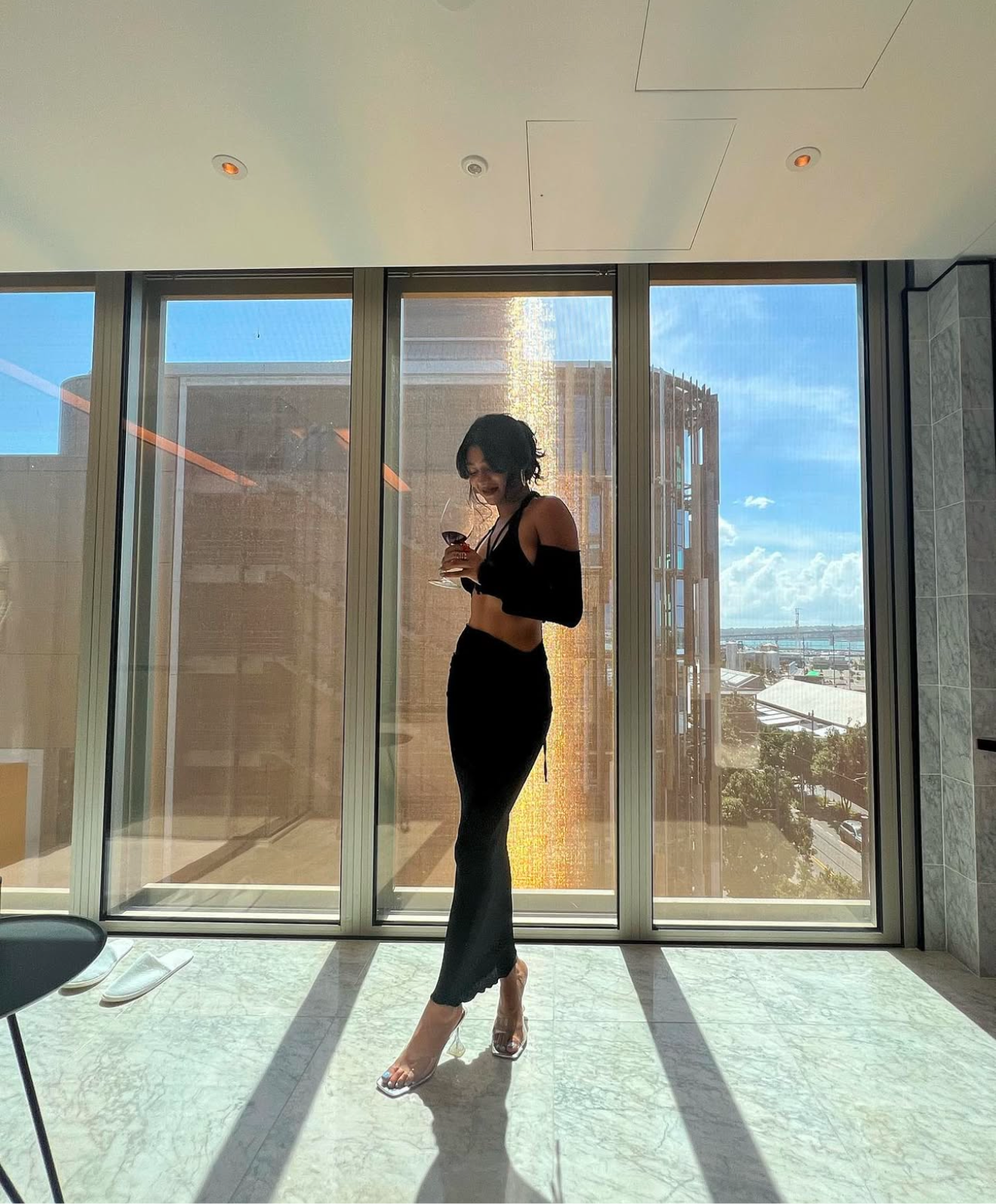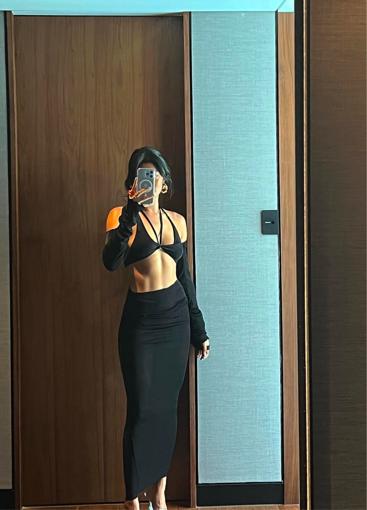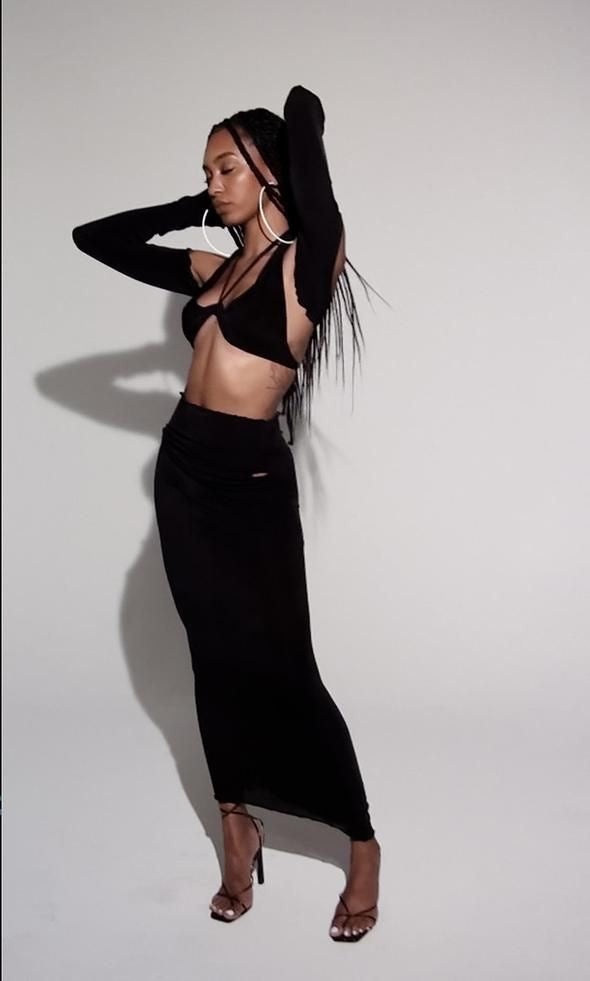 セットにはホルターネッククロップトップ、ミディスカート、オイスタースリーブが含まれます