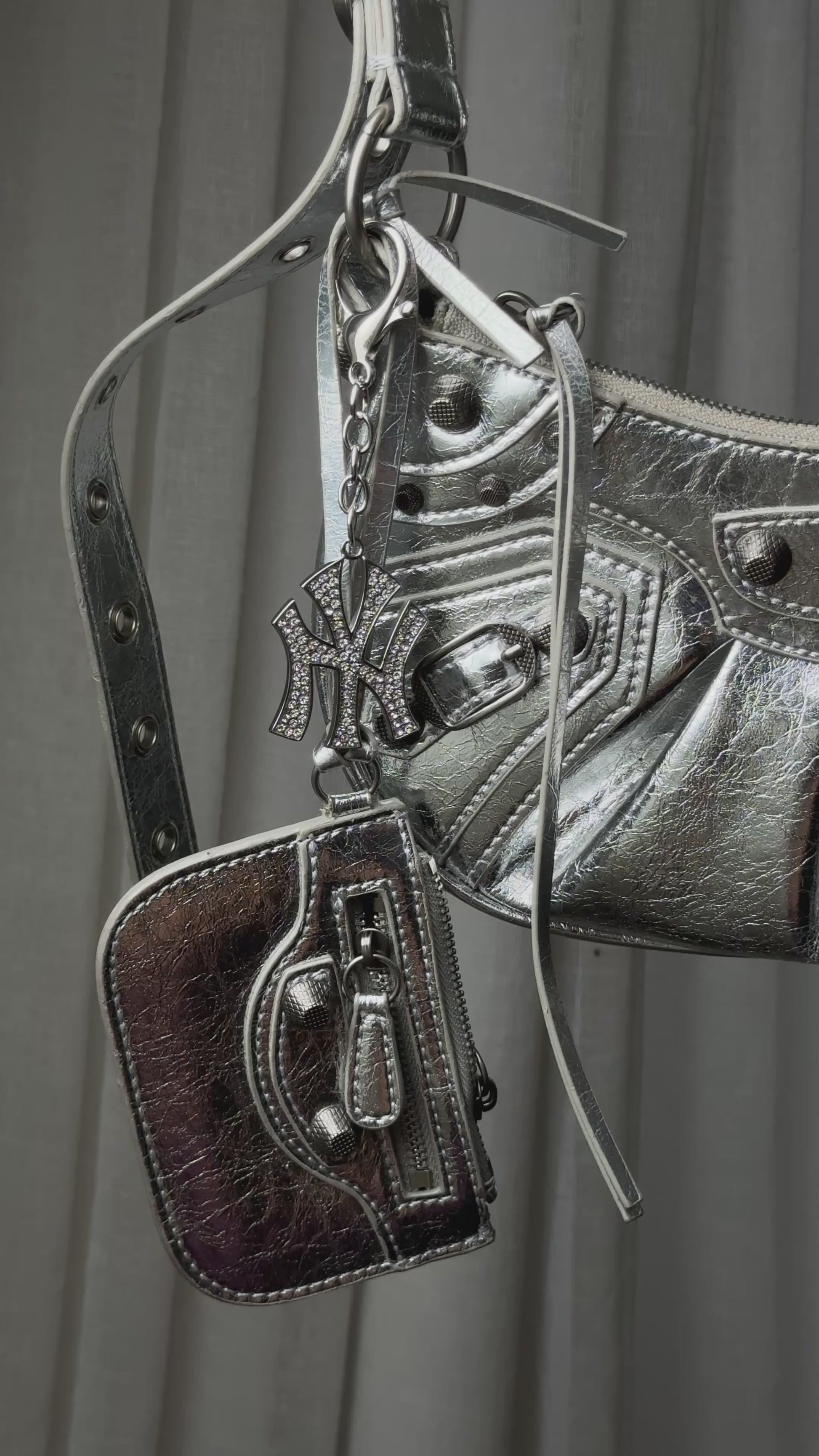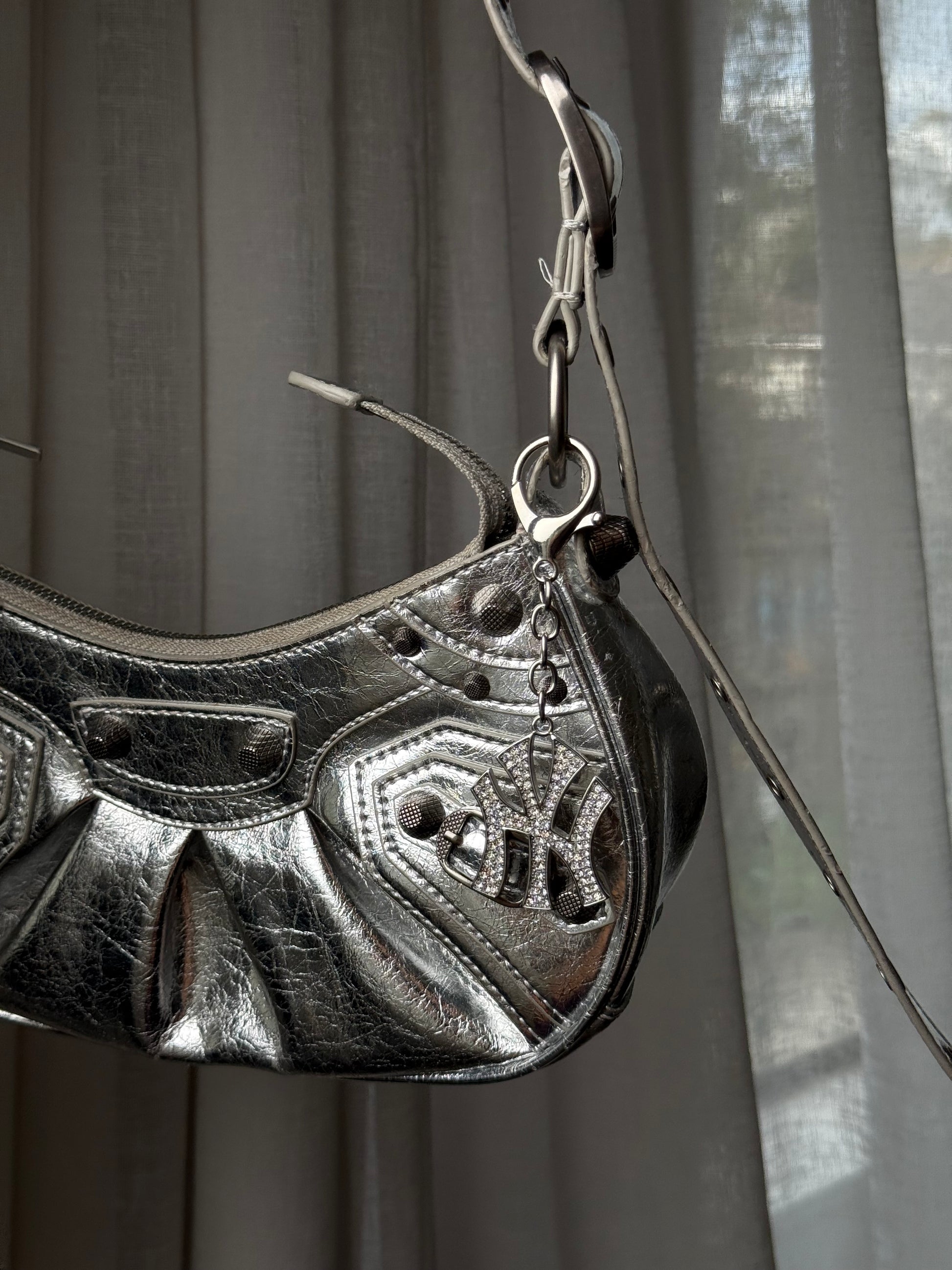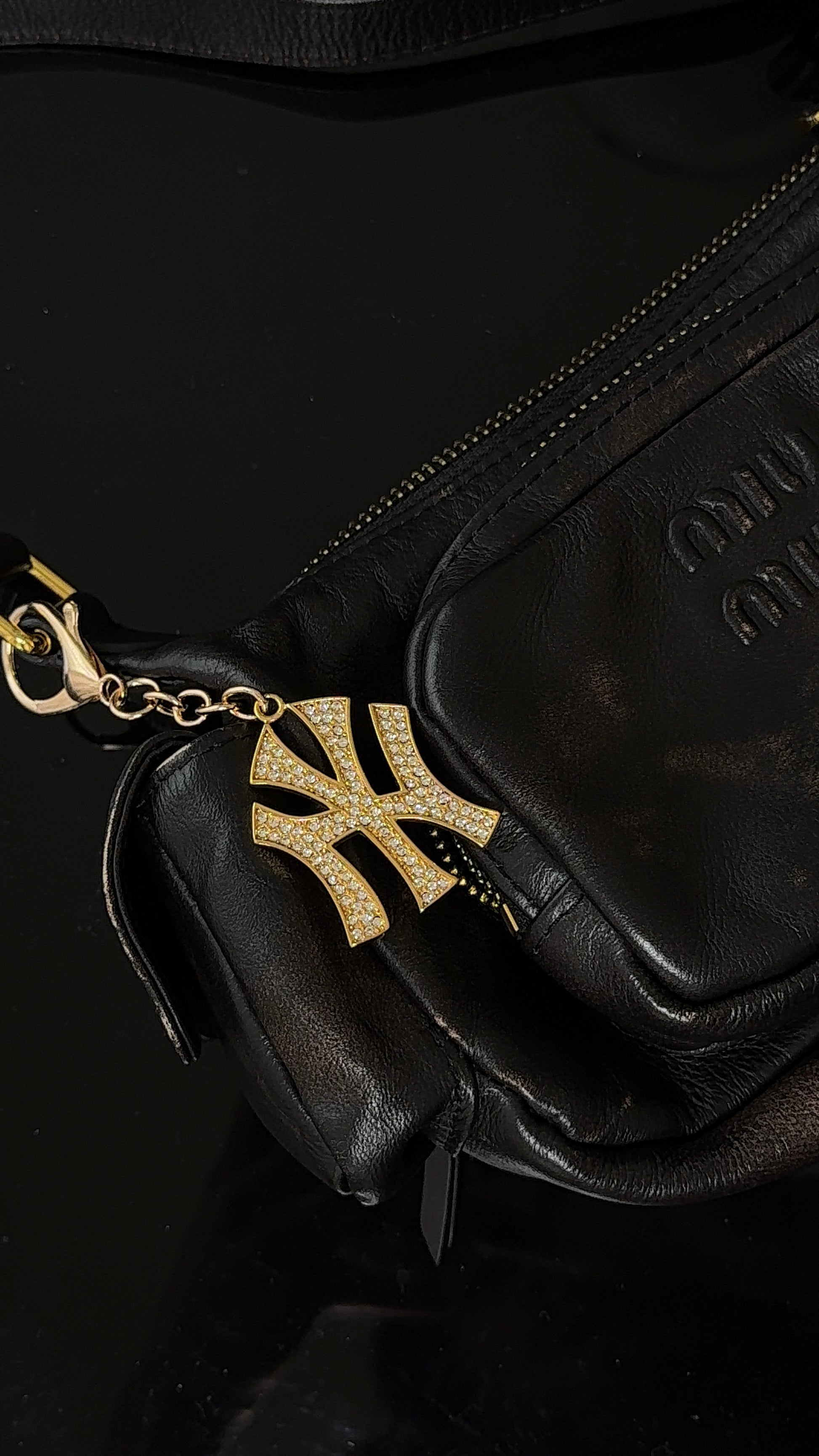 ヤンキーキーチェーン&バッグチャームは、キーやバッグに映える究極のステートメントピース。きらめくクリスタルをちりばめたNYロゴが、周りの視線を釘付けにします。お気に入りのハンドバッグにクリップで留めたり、普段使いのキーホルダーに付け替えたりと、どんなスタイルにもさりげなくストリート感とラグジュアリー感をプラスします。