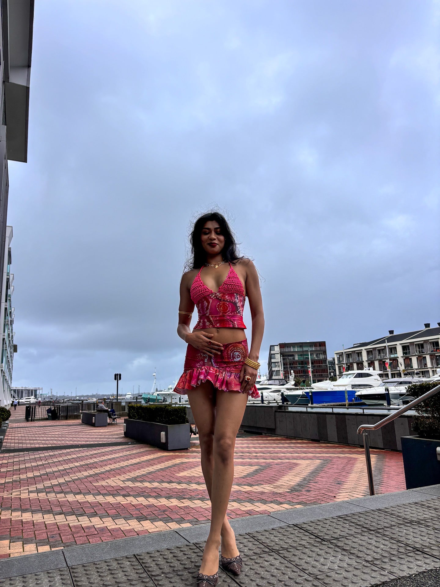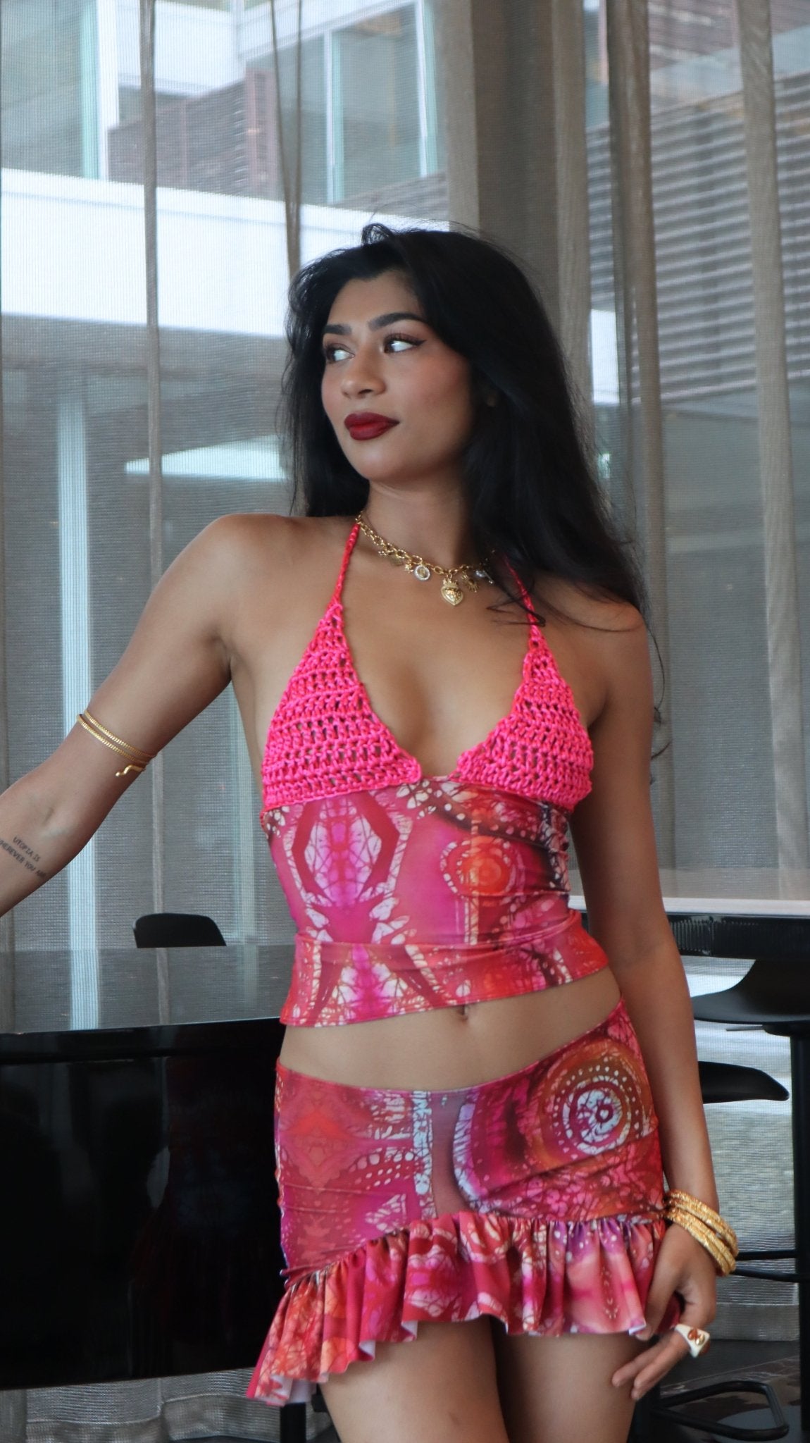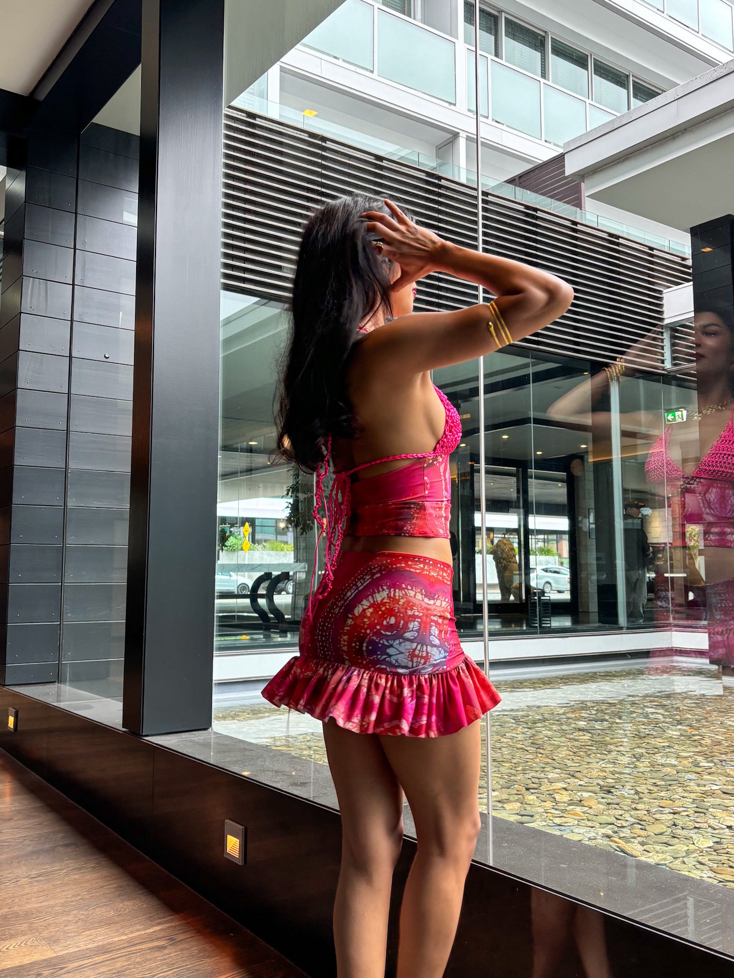 The Asymmetric Rara Co-ord in Pink Celtic Batik Print by ELLA MIA! This viral set has sold out THREE TIMES, handmade in the UK & made consciously so you know you’l be the only one in the room wearing this set! It offers a highly flattering and versatile silhouette. Made from luxurious fitted satin fabric with a unique, custom pink Celtic print, this co-ord set hugs you in all the right places and exudes elegance and sophistication✨ The skirt and crochet top can also be hired individually for even more styling options