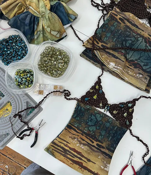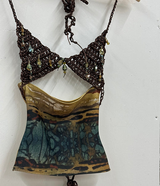 super stretch batik printed original artwork printed 2 piece, rara skirt and satin crochet beaded top <3