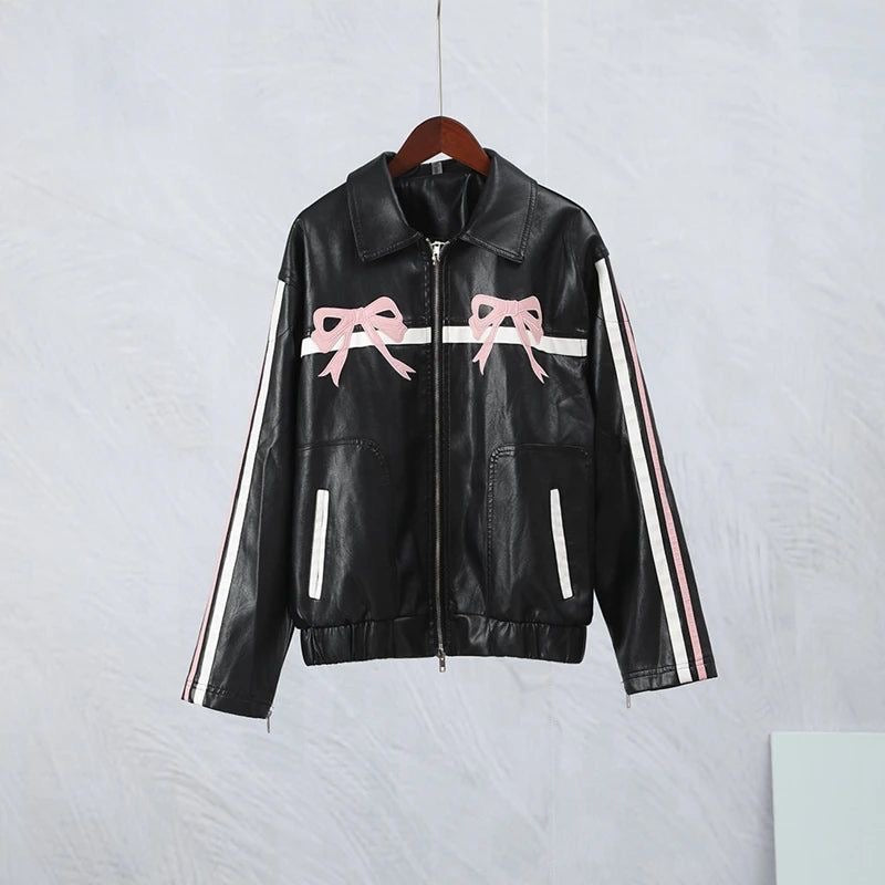 The Harajuku Biker Jacket: the perfect combination of style and versatility! Elevate any outfit with this season's cutest bomber jacket featuring a beautiful bow design. Made for layering and boasting a trendy leather look.