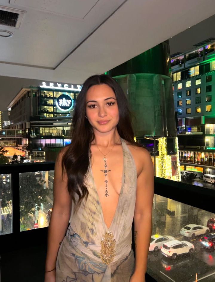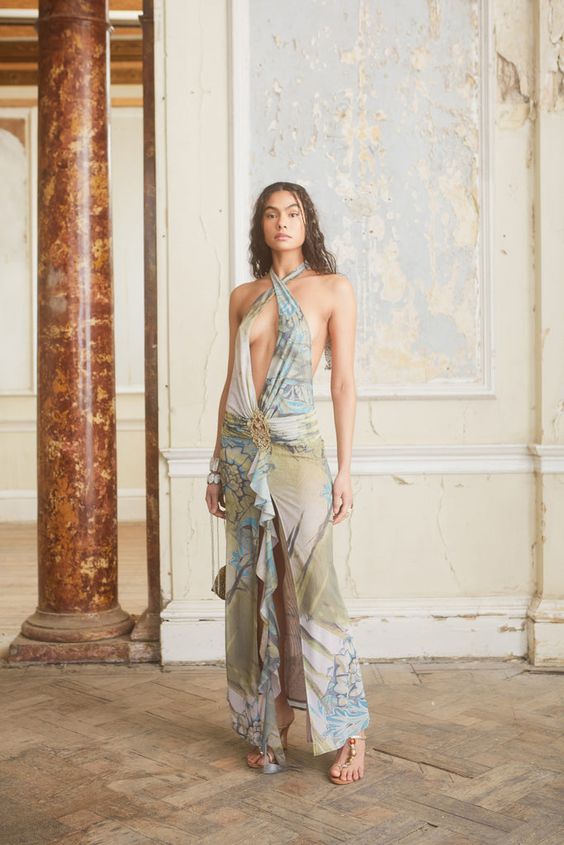Crafted from a lightweight fabric, the Cindy Plunge Dress features a halter neck detail, beaded embroidery and a sunset oriental print enhanced by a nude-lined front split and maxi length