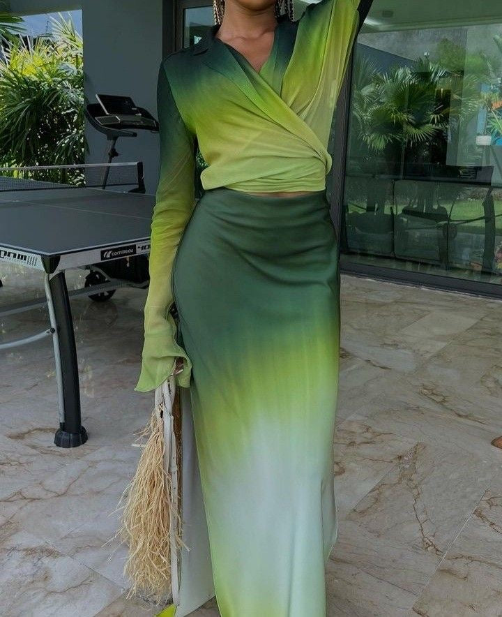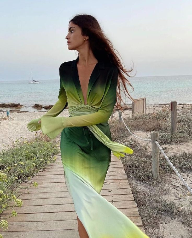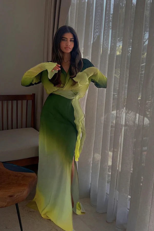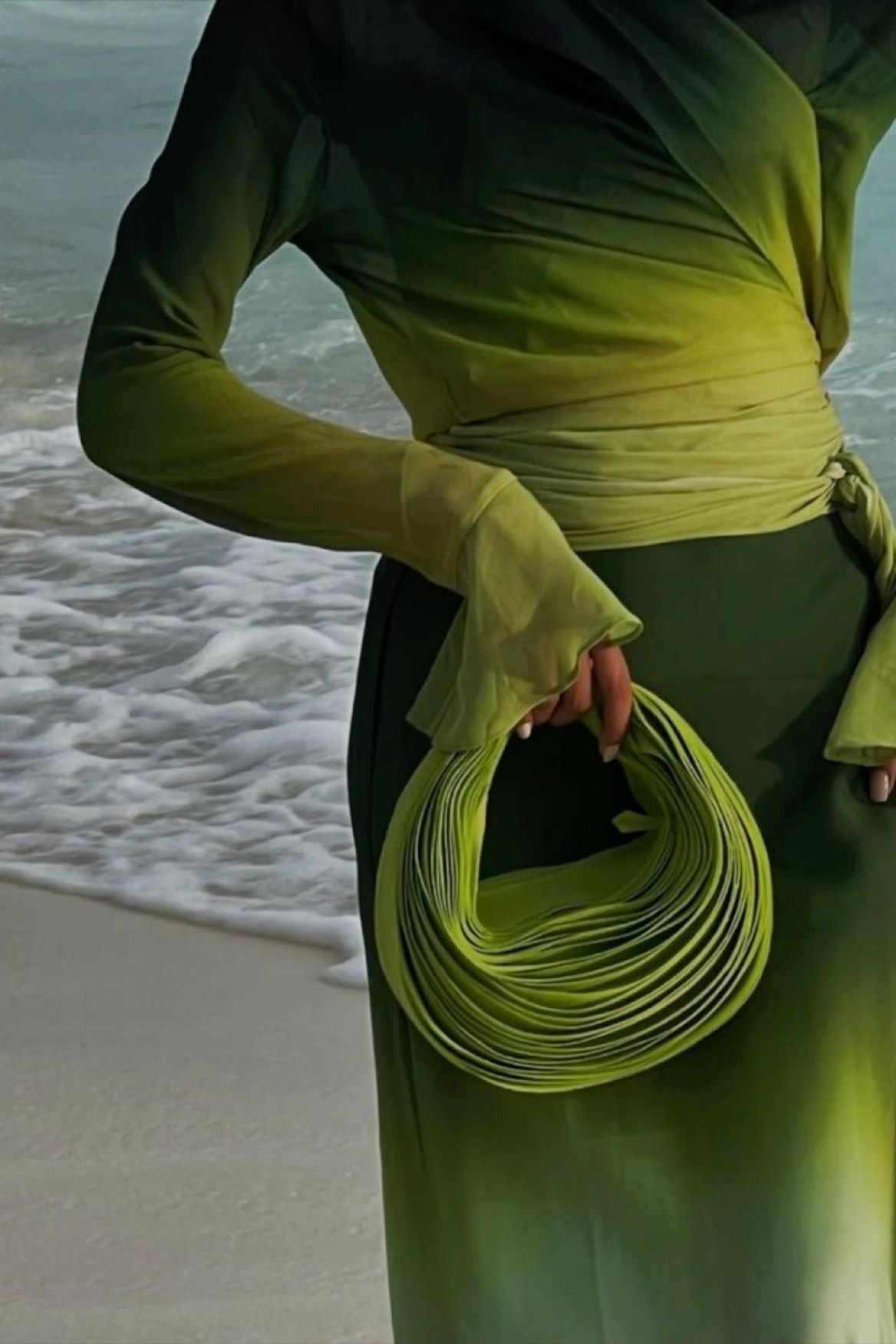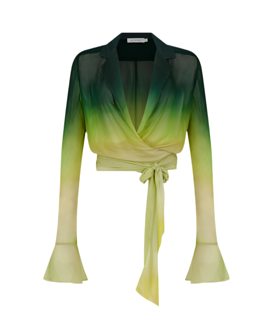 A signature, semi-sheer Rat & Boa shape remixed in dip-dyed green, Cypress is a dreamy mix of fluted sleeves, fiercely feminine spirit and wrap-around ties just waiting to be worn your way.
