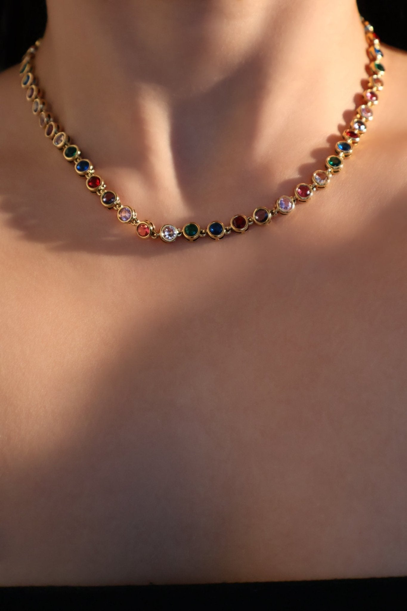 Add a playful touch of luxury to your look with the Dolce Choker — a radiant blend of colour and elegance. This statement piece features multi-coloured zircon stones, each one carefully set into an 18k gold-plated stainless steel base. Designed to sit beautifully at choker length, it also includes a 5cm adjustable chain for your perfect fit.