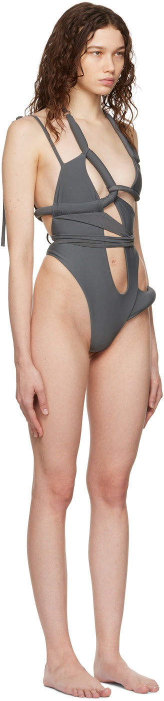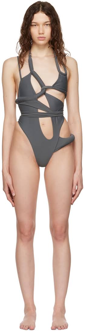 ENTIRE STUDIOS Panelled stretch nylon jersey one-piece swimsuit. Self-tie straps and padding throughout. · Tab-slot closure at back · Full jersey lining Supplier color: Coal