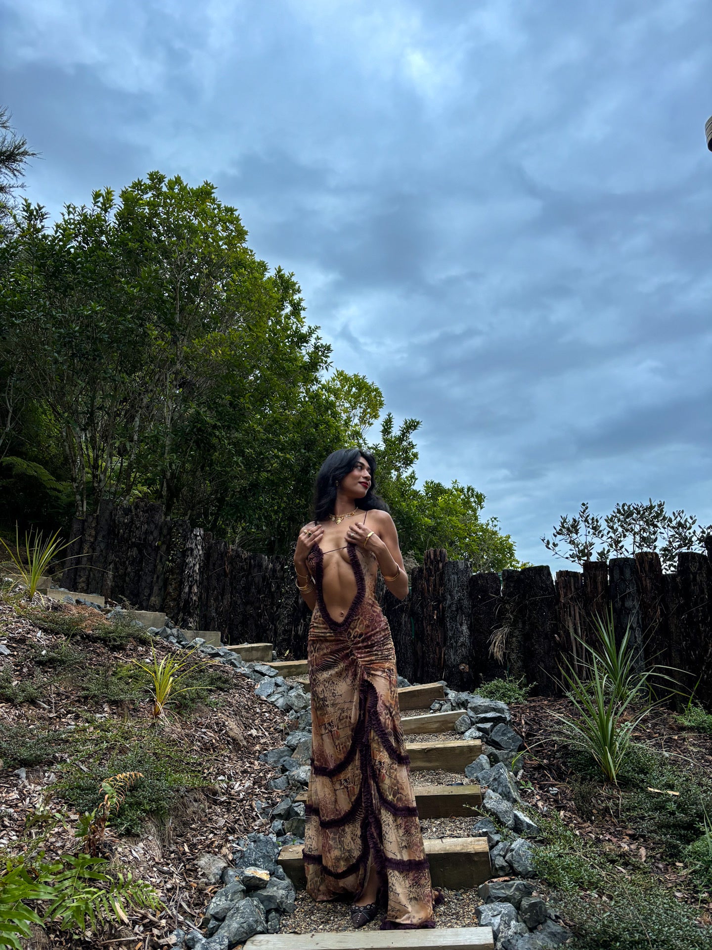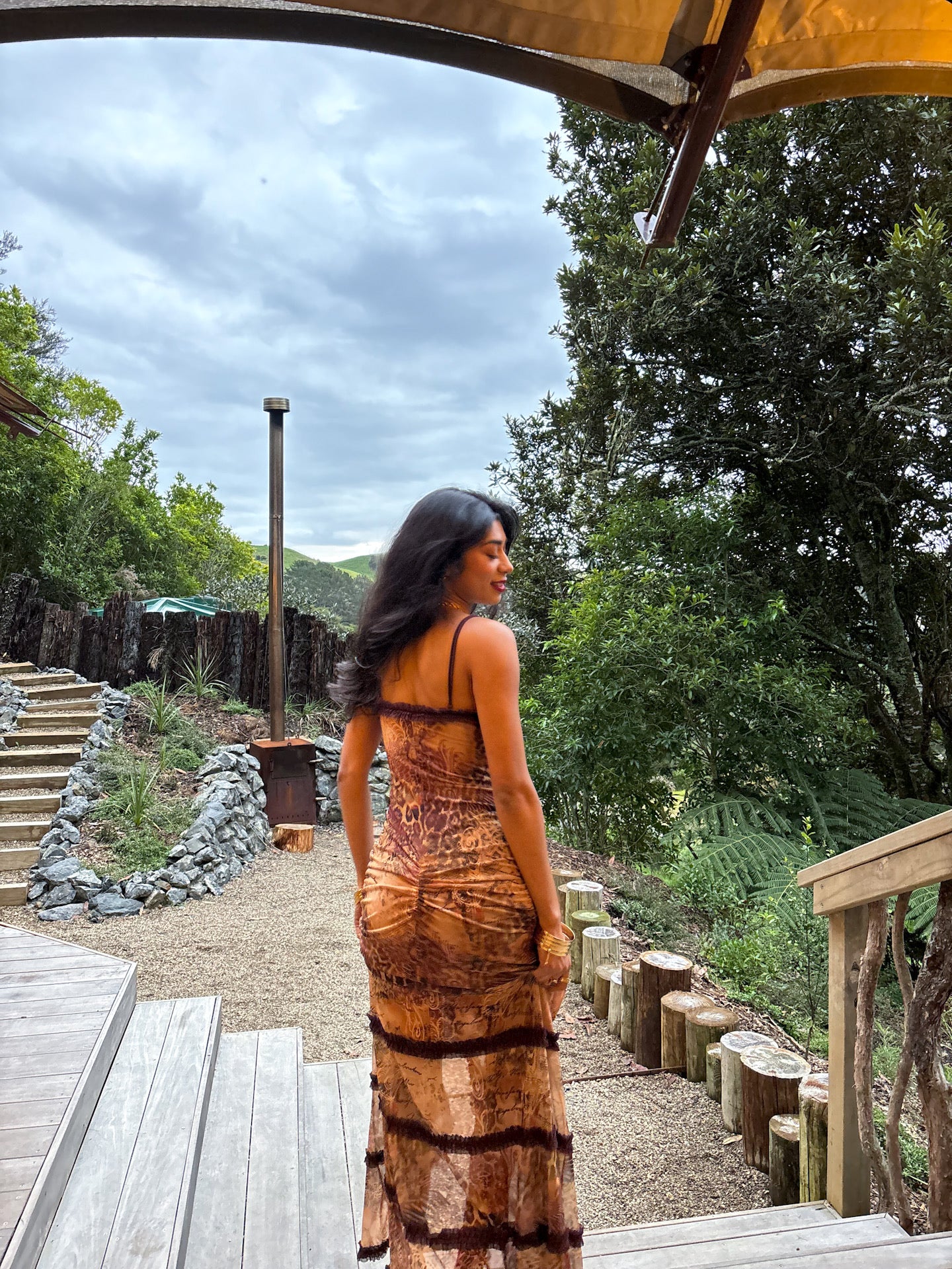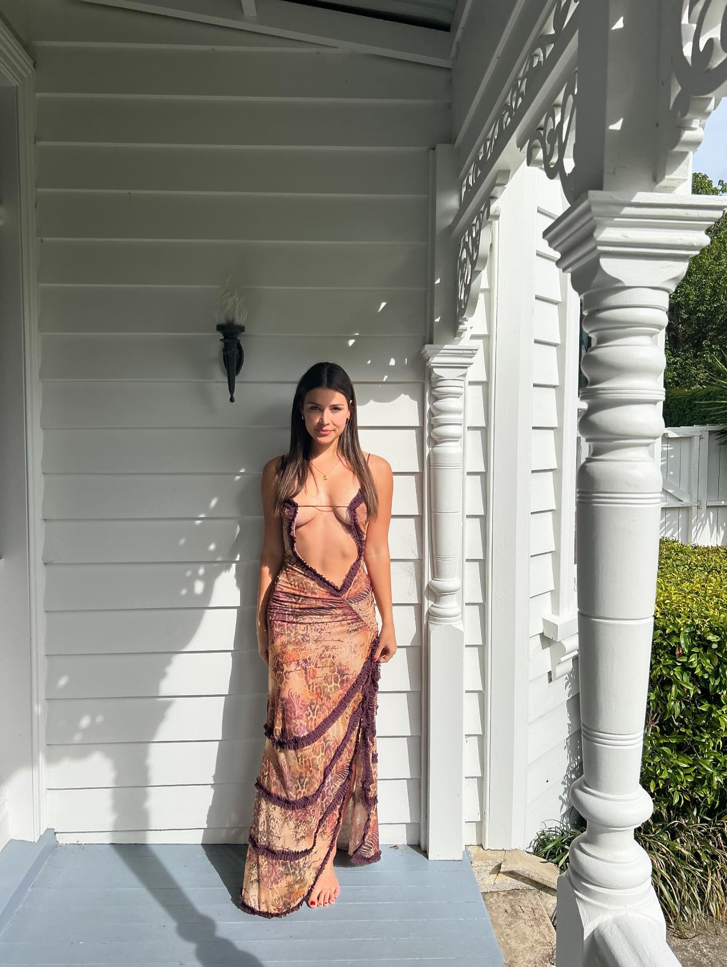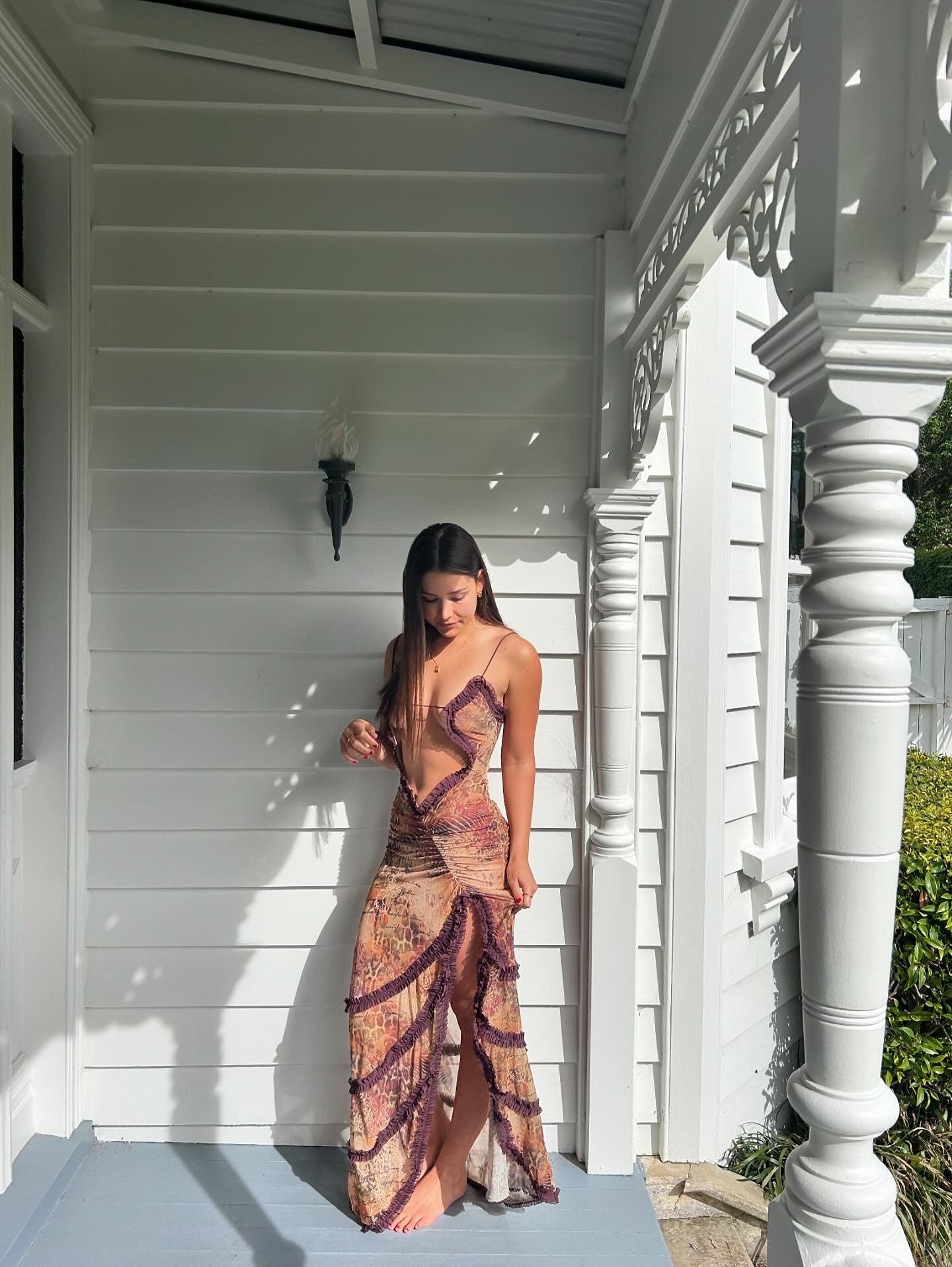 Crafted for standout sophistication, this leopard script print maxi dress features adjustable straps for a versatile wear, and a daring thigh-high split. This maxi-length dress is complete with an intricate ruched front and side seam detailing and a burgundy mesh ruffle trim finish.