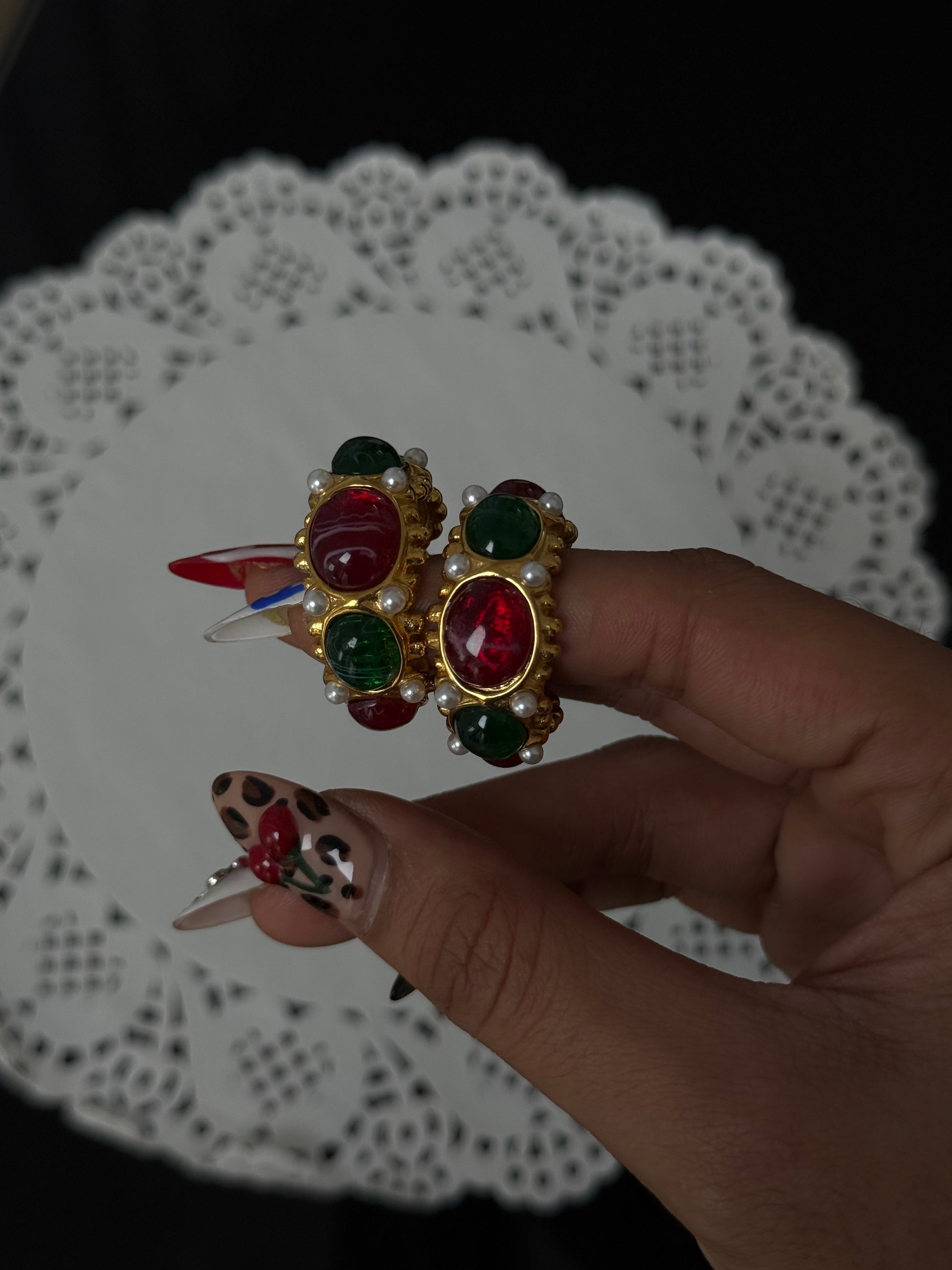 These stunning 18k gold-plated statement hoops are adorned with glossy deep emerald-green stones and vibrant ruby-red cabochons, accented by delicate faux pearls for the perfect festive sparkle. The bold colour combination and intricate gold detailing create a timeless, art-inspired design that feels both luxe and unique.