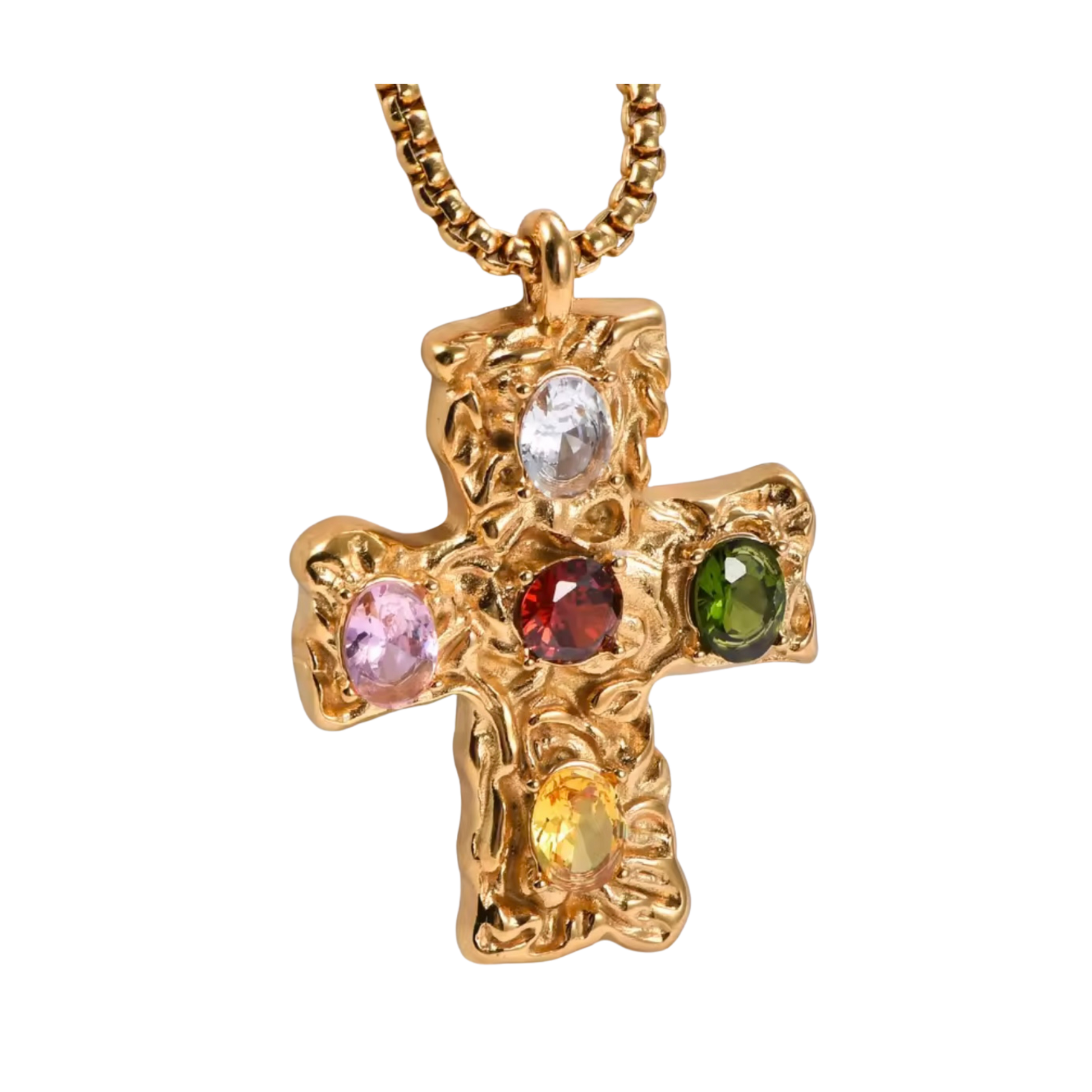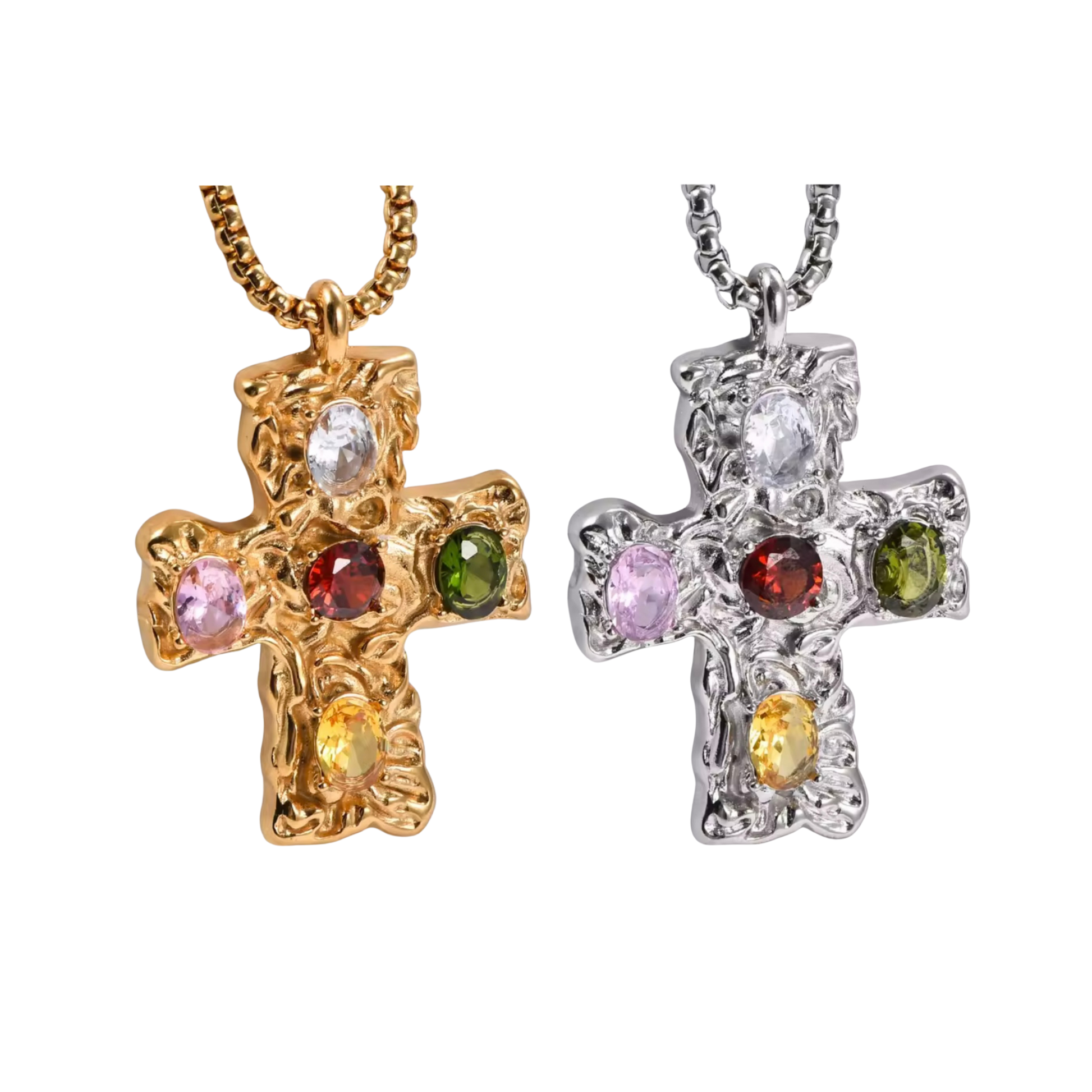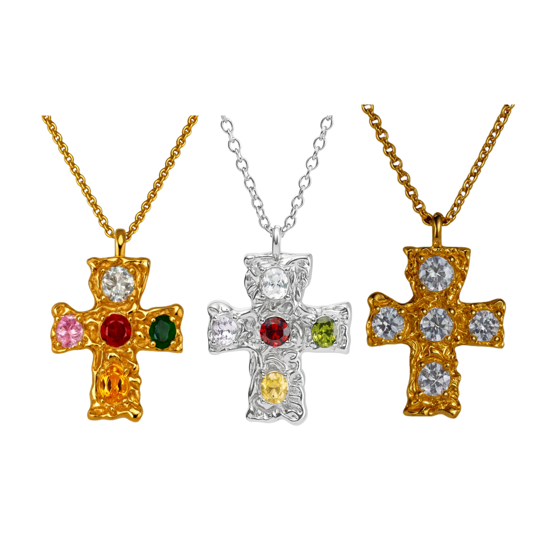 the cross that’s stealing the spotlight. Our Melted Cross Necklace is crafted from premium stainless steel and plated in luxe 18k gold or sleek silver — built to last and designed to turn heads. Each piece is adorned with a stunning mix of gemstones in dreamy shades of blush pink, fiery ruby red, rich emerald green, crystal clear, and golden yellow, creating a colour combination that’s impossible to forget.