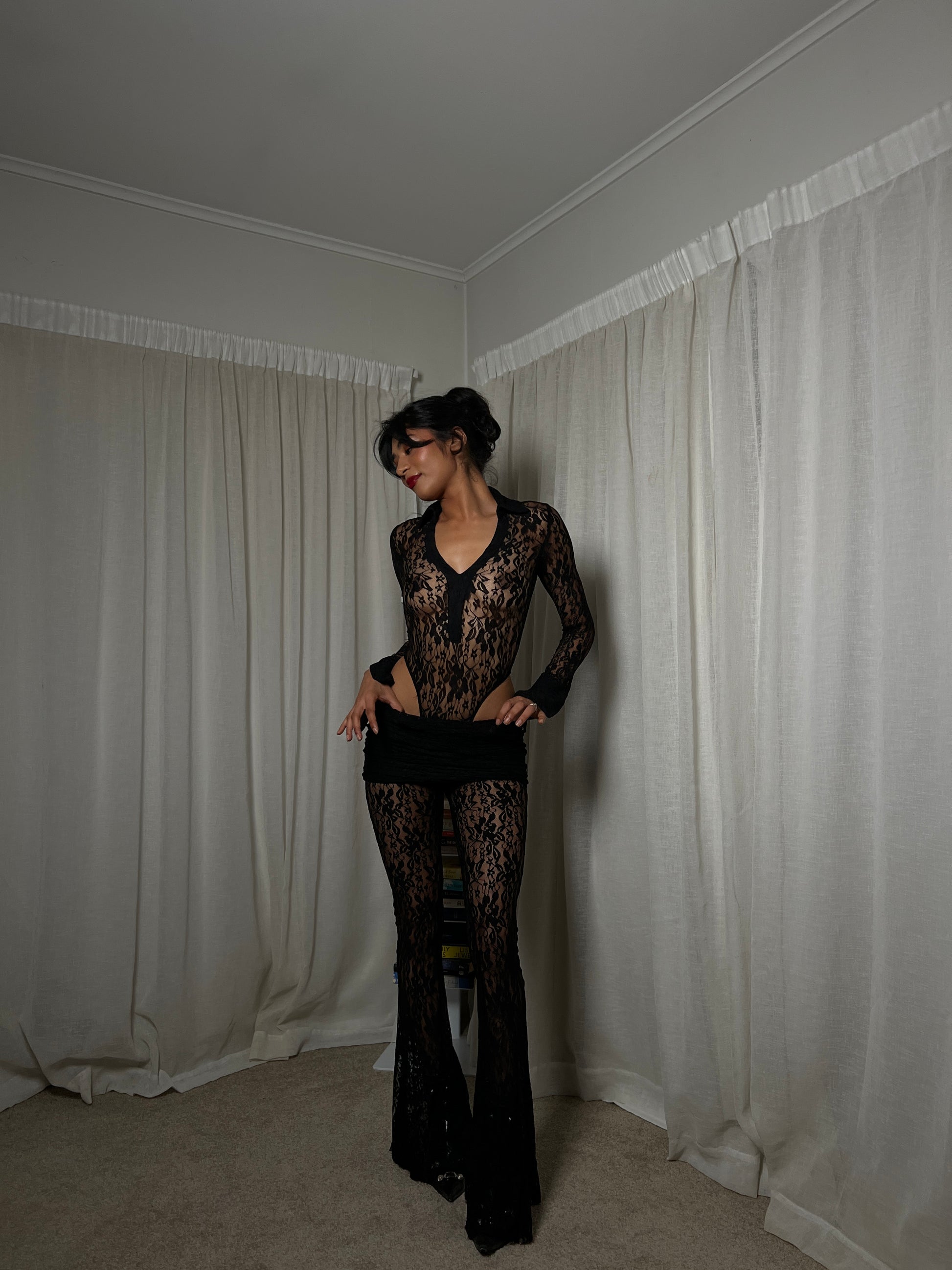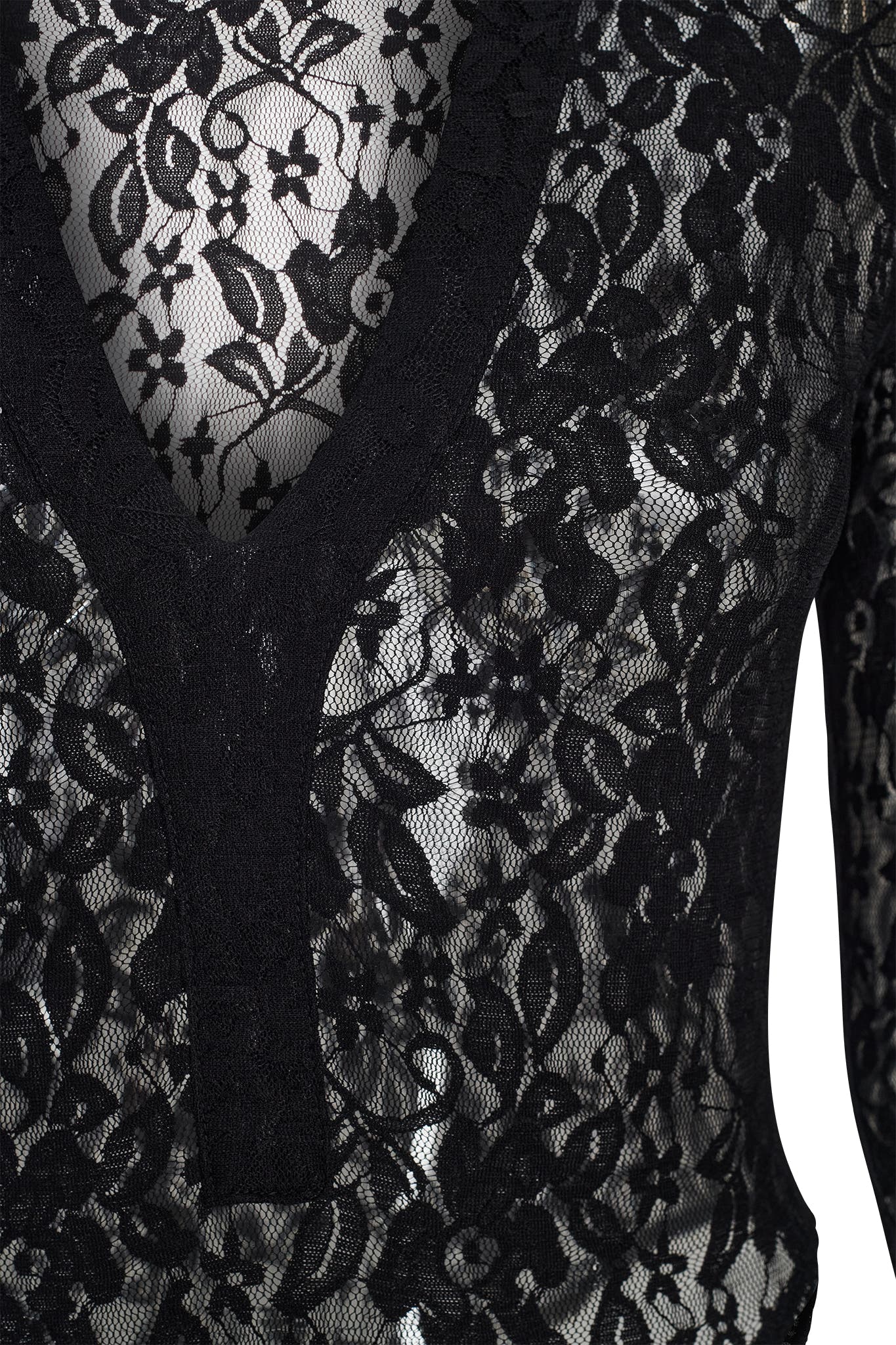 - Black long sleeve bodysuit in an all-over lace fabrication