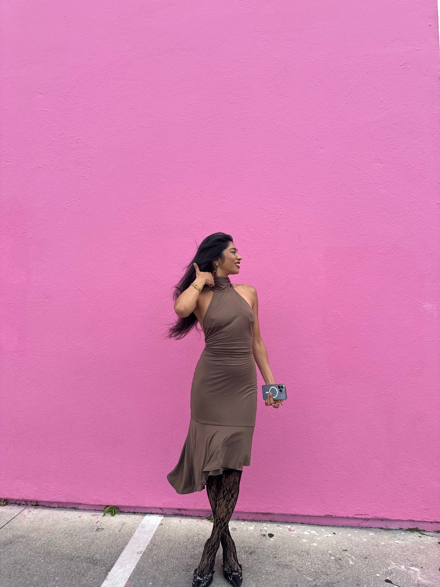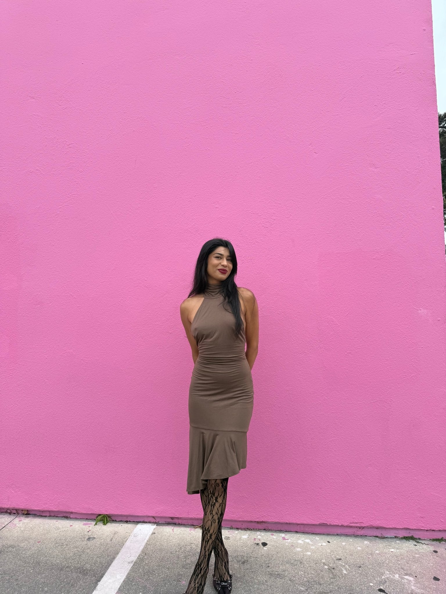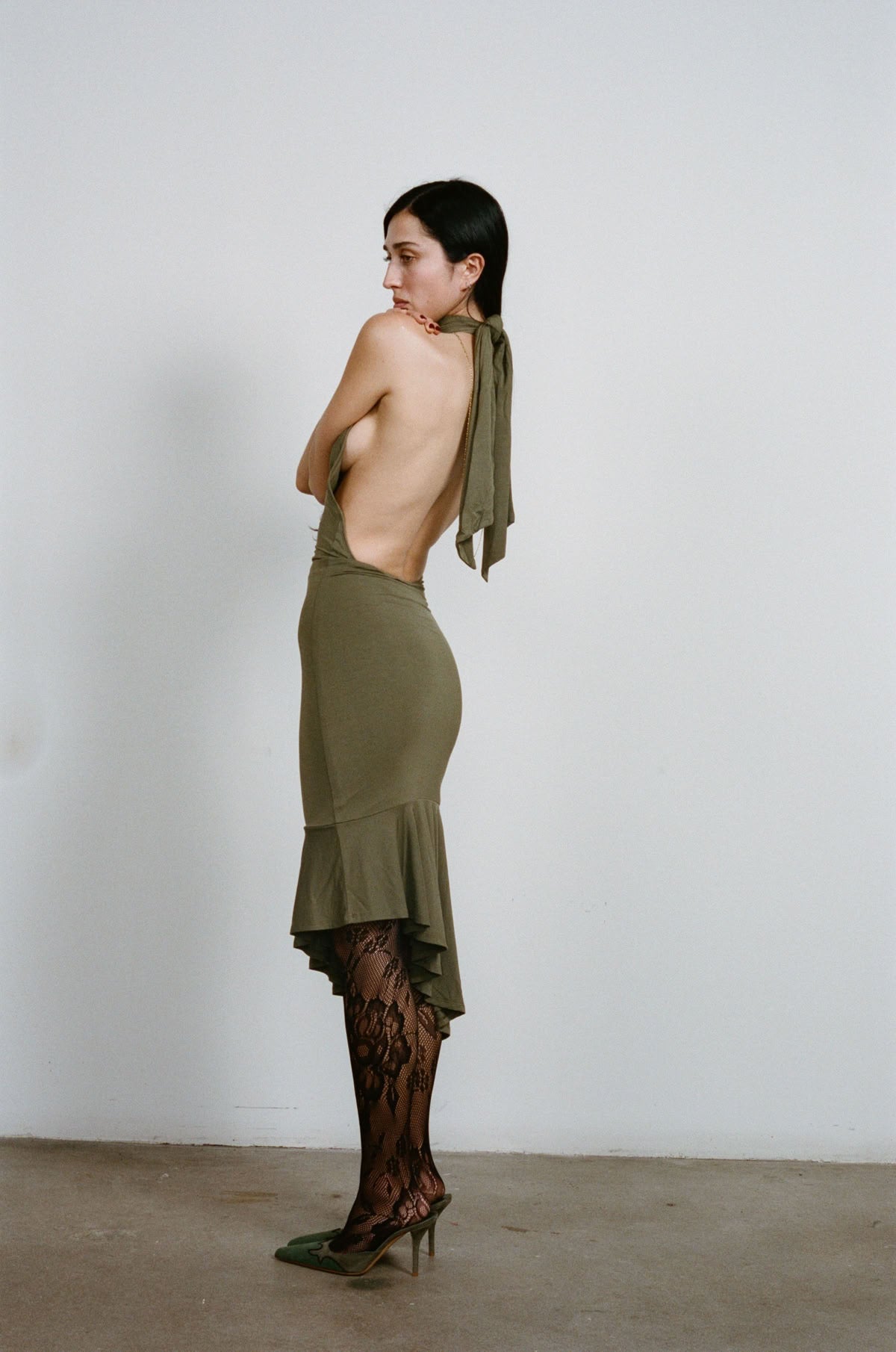 Introducing the highly sought after Karina dress, in Olive. Sold out everywhere! This backless maxi dress features an asymmetrical hem and halter tie top. Made for a tight fit, she's the perfect cocktail dress. Take her out on the town.