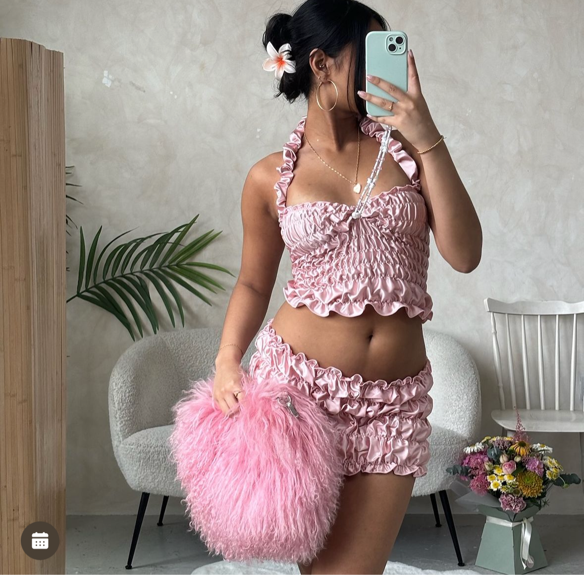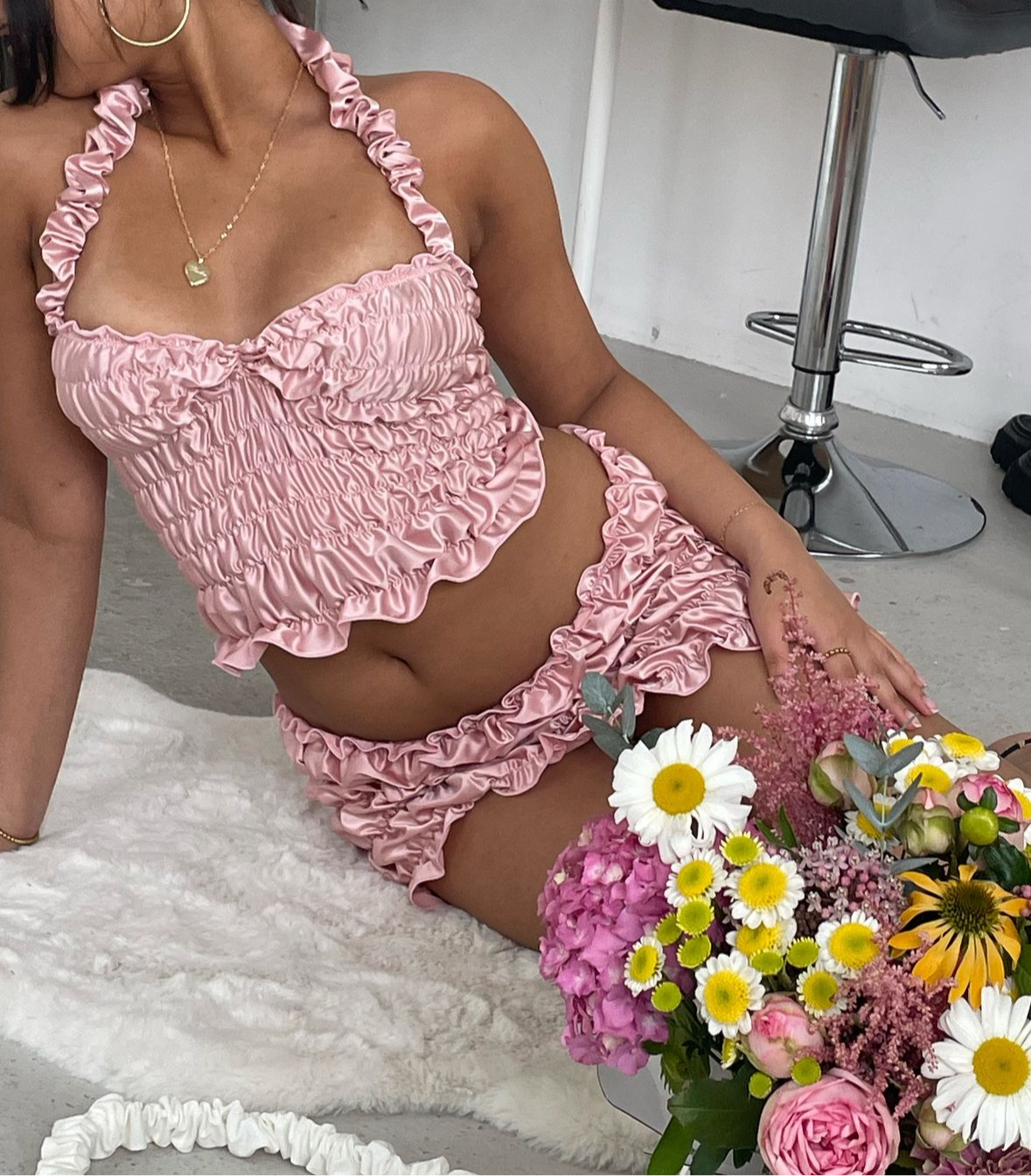 Introducing the Scrunchie Halter Set In Pearl Pink. Featuring a playful ruched design and unique elasticated scrunchie detail, this set is sure to elevate your wardrobe for any occasion.