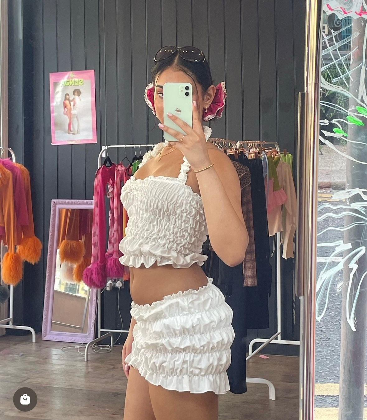 Introducing the White Scrunchie Halter Top. Featuring a playful ruched design and unique elasticated scrunchie detail, this top is sure to elevate your wardrobe for any occasion. Style it With Our Matching Skirt , Or your fav pair of jeans!