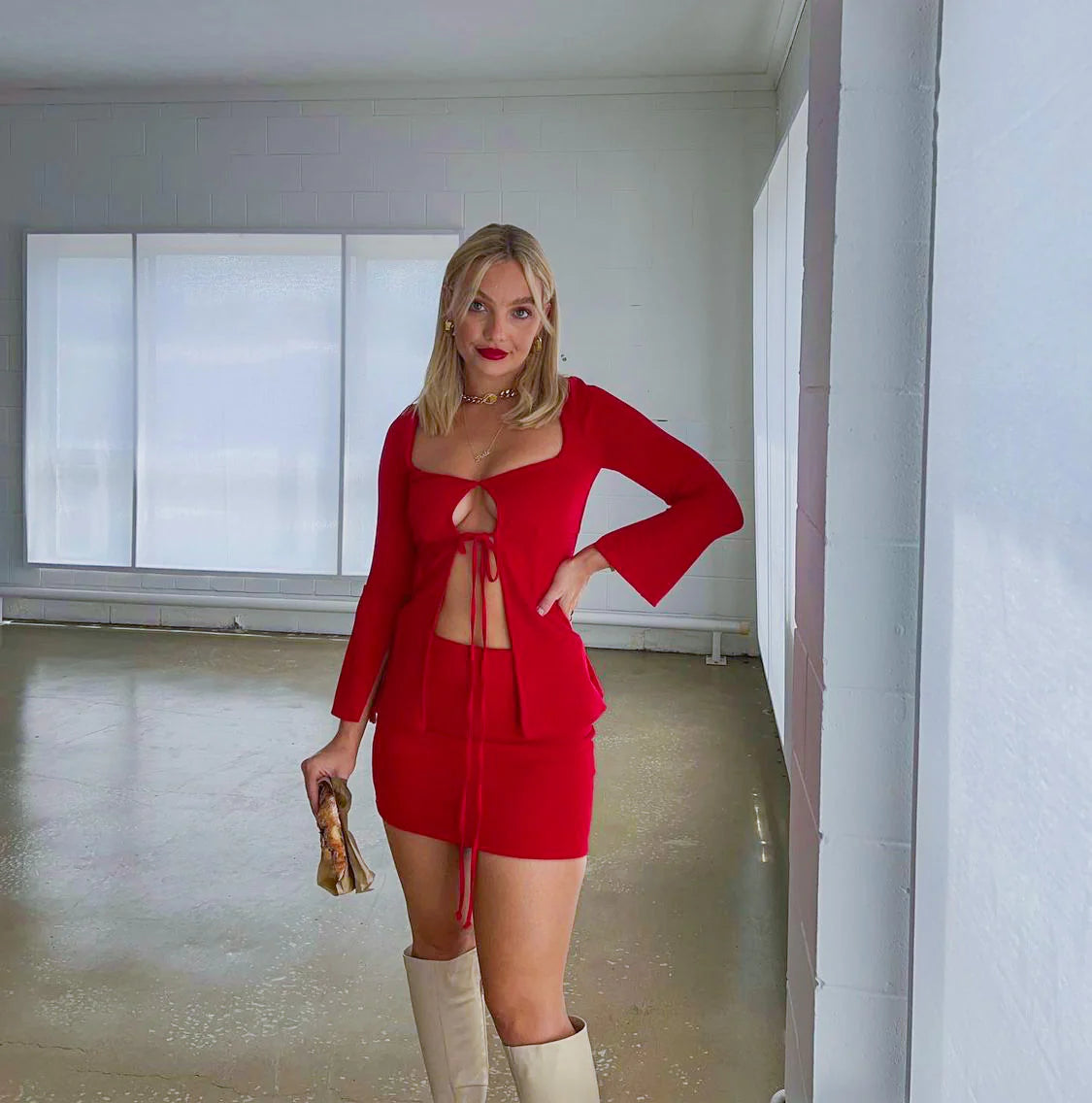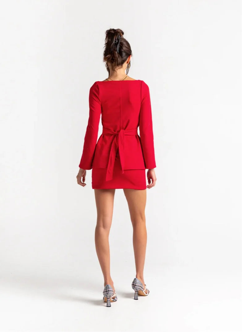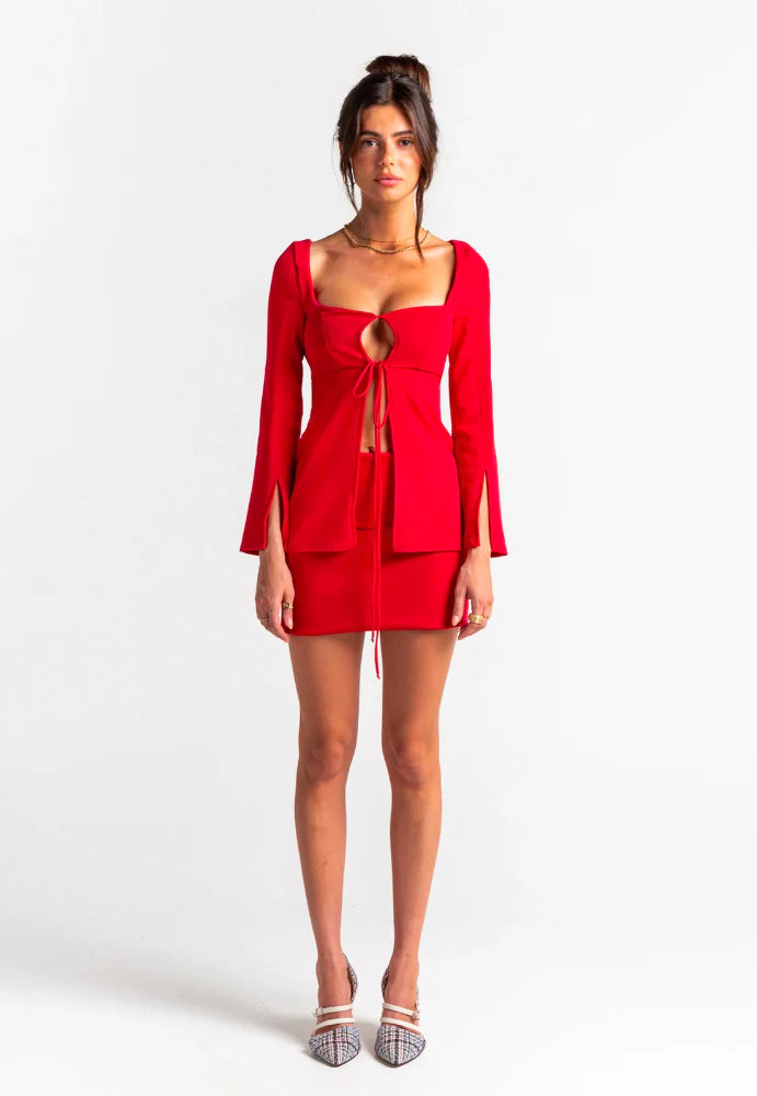 Stunning red Arcina Ori ensemble ideal for cocktail gatherings, 21st celebrations, and exciting nights out! The set includes a versatile mini skirt with a foldover top, allowing for adjustable length. The top boasts long sleeves with stylish splits at the cuffs and intricate tie detailing at the centre of the bust.