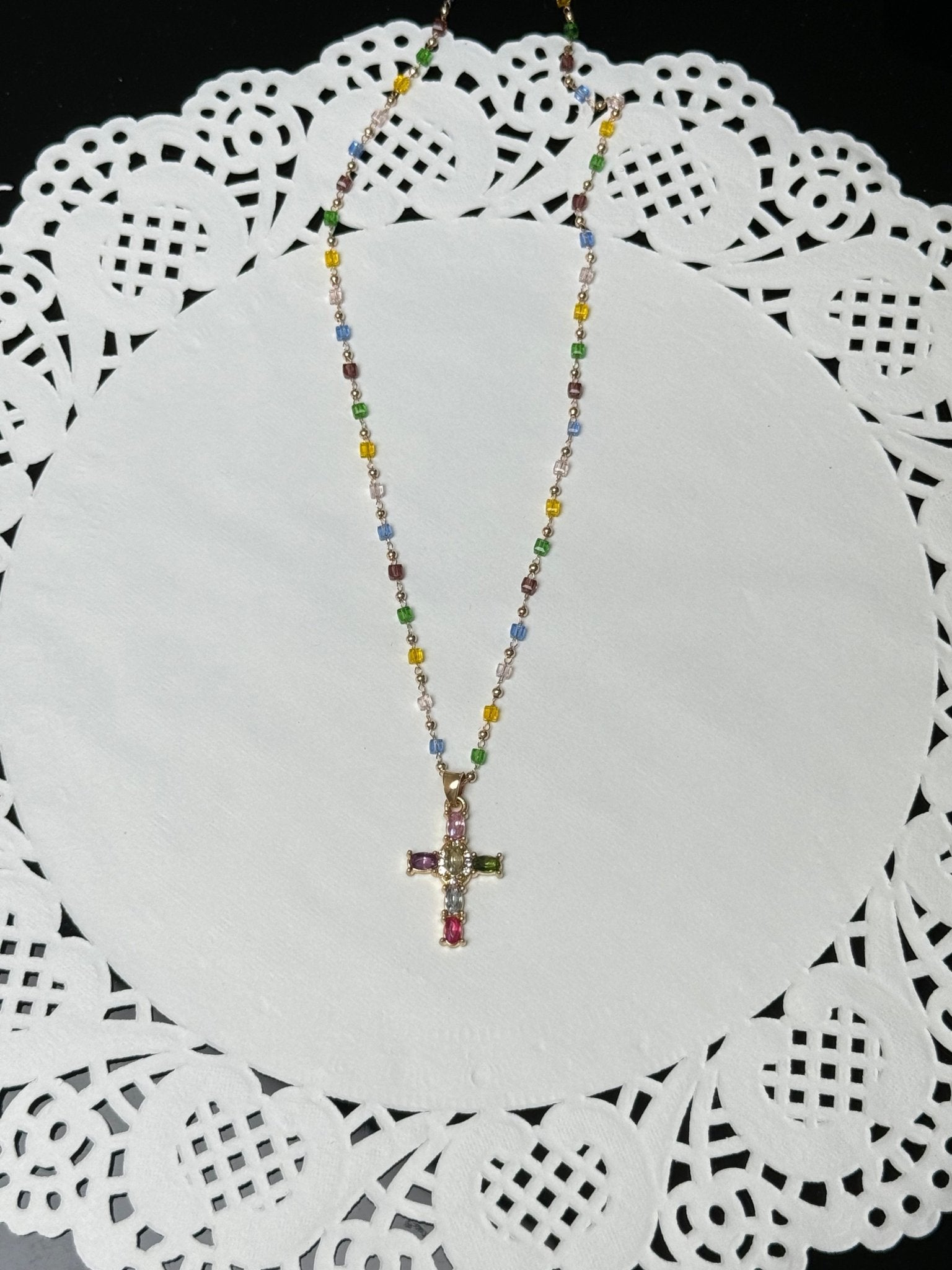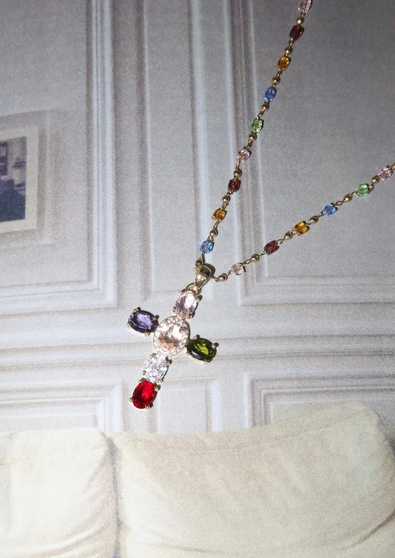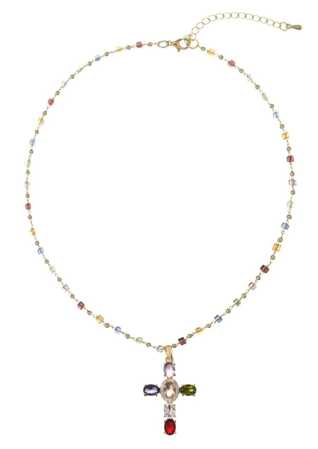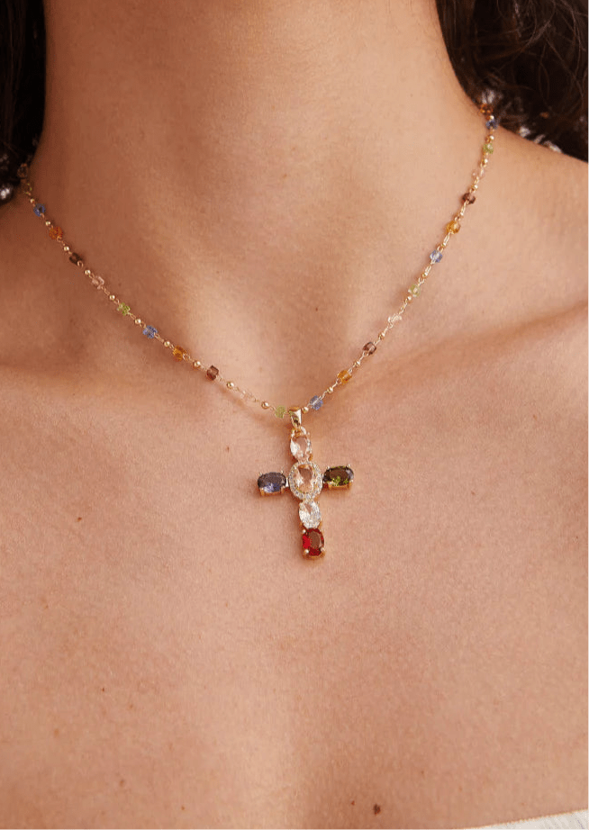 Bold, bright, and beautifully blessed — the Serenna Cross Necklace is where timeless symbolism meets vibrant modern style. Intricately crafted with colorful zirconia beads and a delicately formed cross pendant, this piece radiates elegance and individuality. Sparkling crystals bring a luxe touch, while the playful palette channels that Dolce Vita spirit — joyful, free, and effortlessly chic.