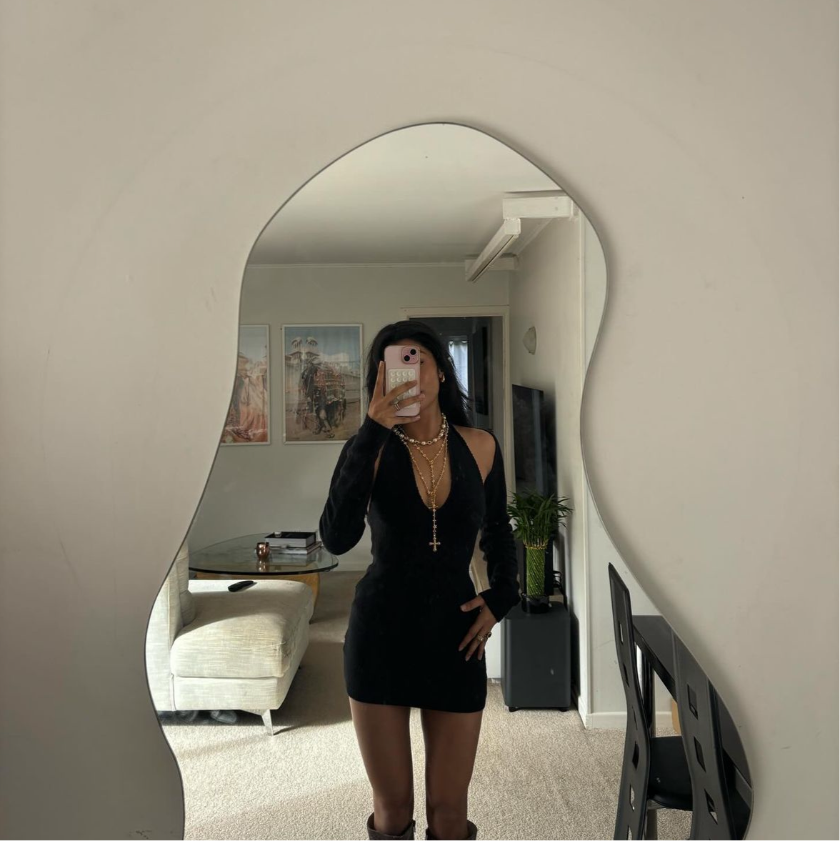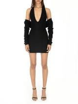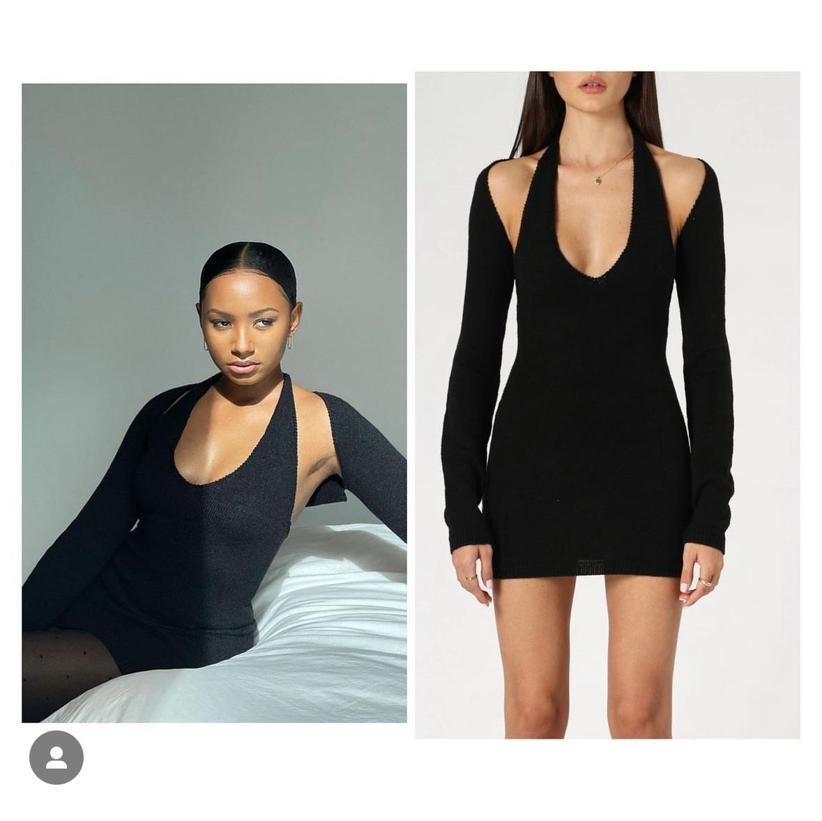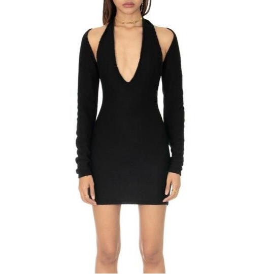 The SHERA dress set with mini cardigan (can be worn with cardigan or without) Crafted with a knitted viscose and nylon blend Hand made knitted edge Halter neck with tie closure Cut for a fitted silhouette Mid weight black fabric *this dress comes with a cardigan**