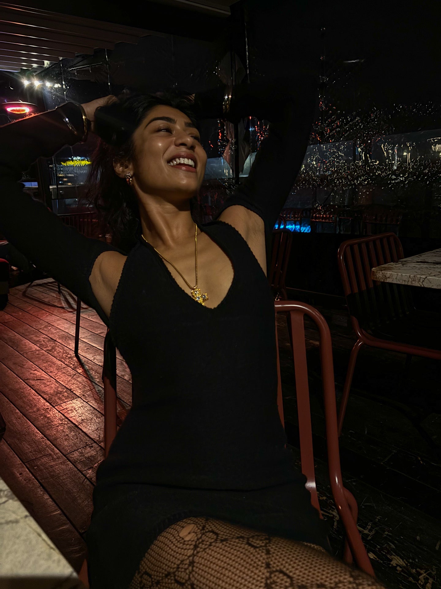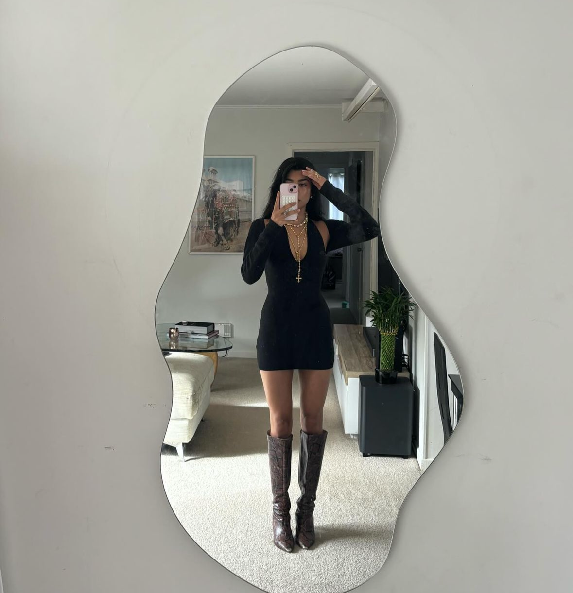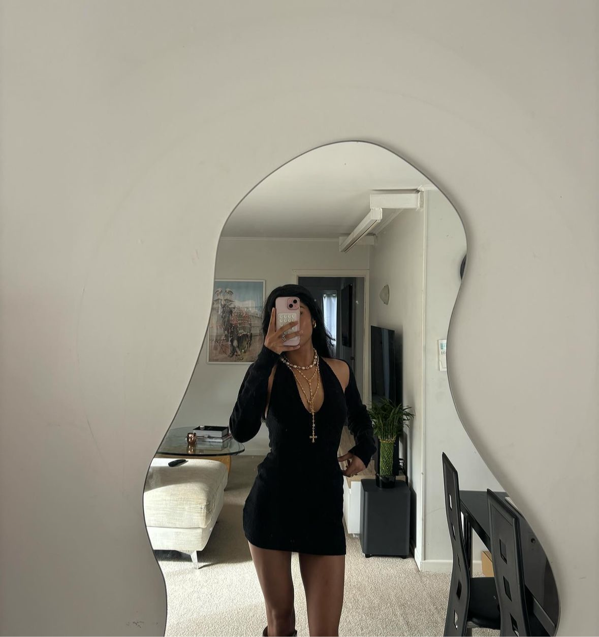 The SHERA dress set with mini cardigan (can be worn with cardigan or without) Crafted with a knitted viscose and nylon blend Hand made knitted edge Halter neck with tie closure Cut for a fitted silhouette Mid weight black fabric *this dress comes with a cardigan**