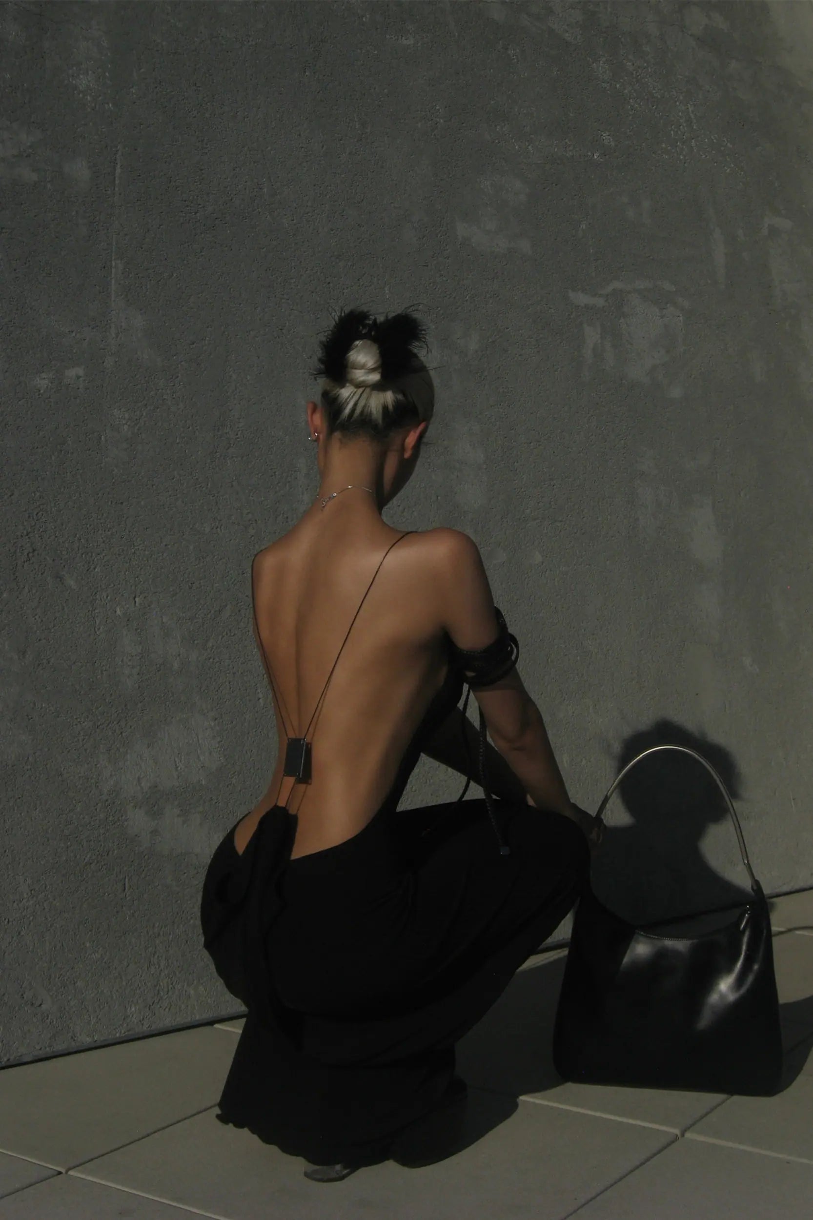 The draped fabric moves beautifully on the body, and the backless detail with silver hardware sits perfectly along the lower back, accentuating all the right curves and adding that extra edge. It’s sexy without trying too hard, timeless but still bold.