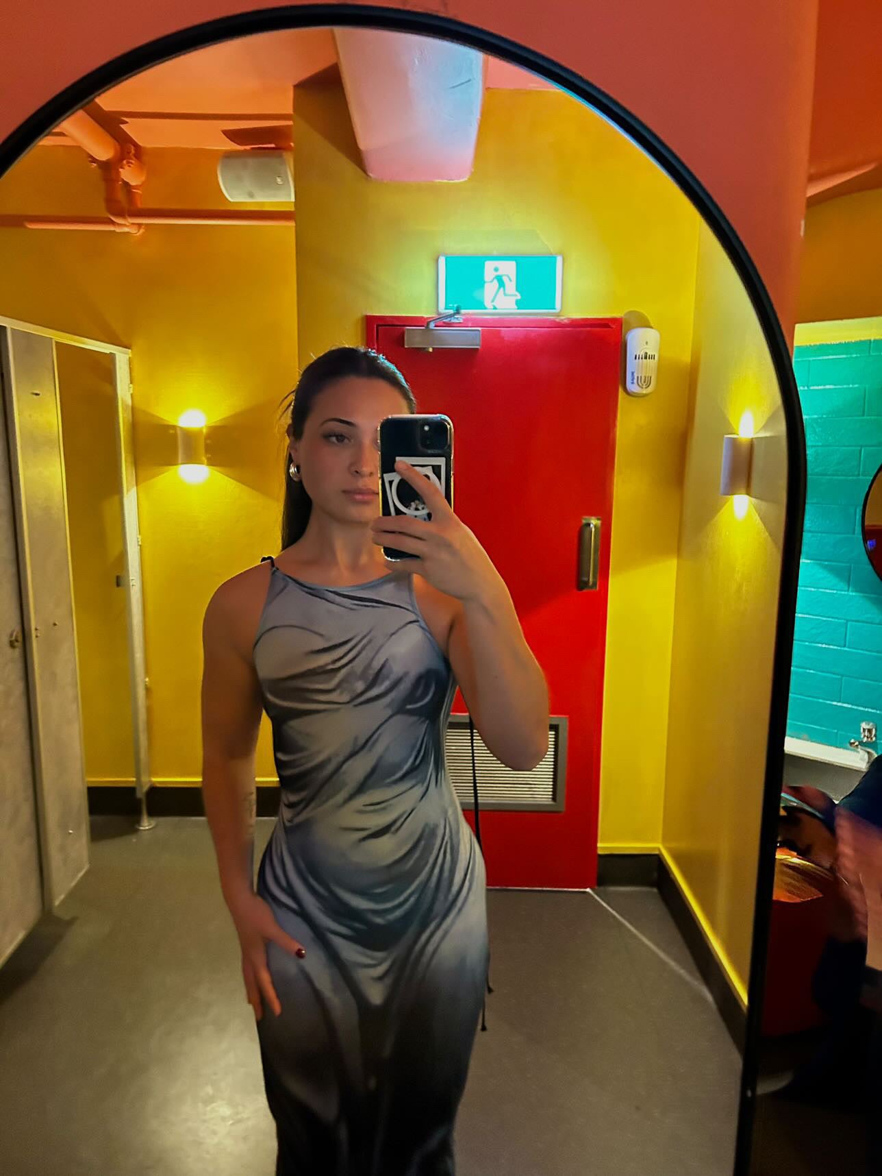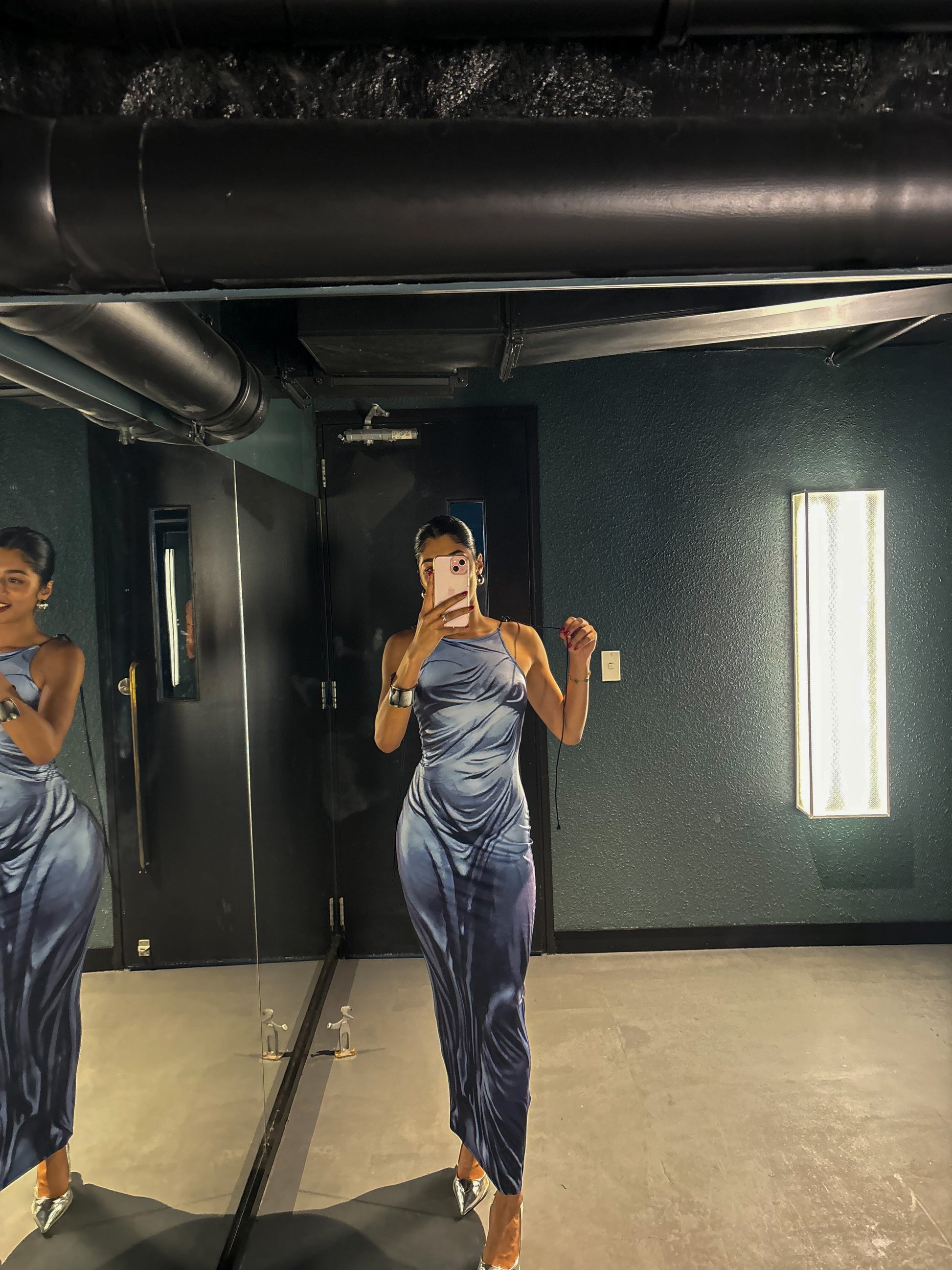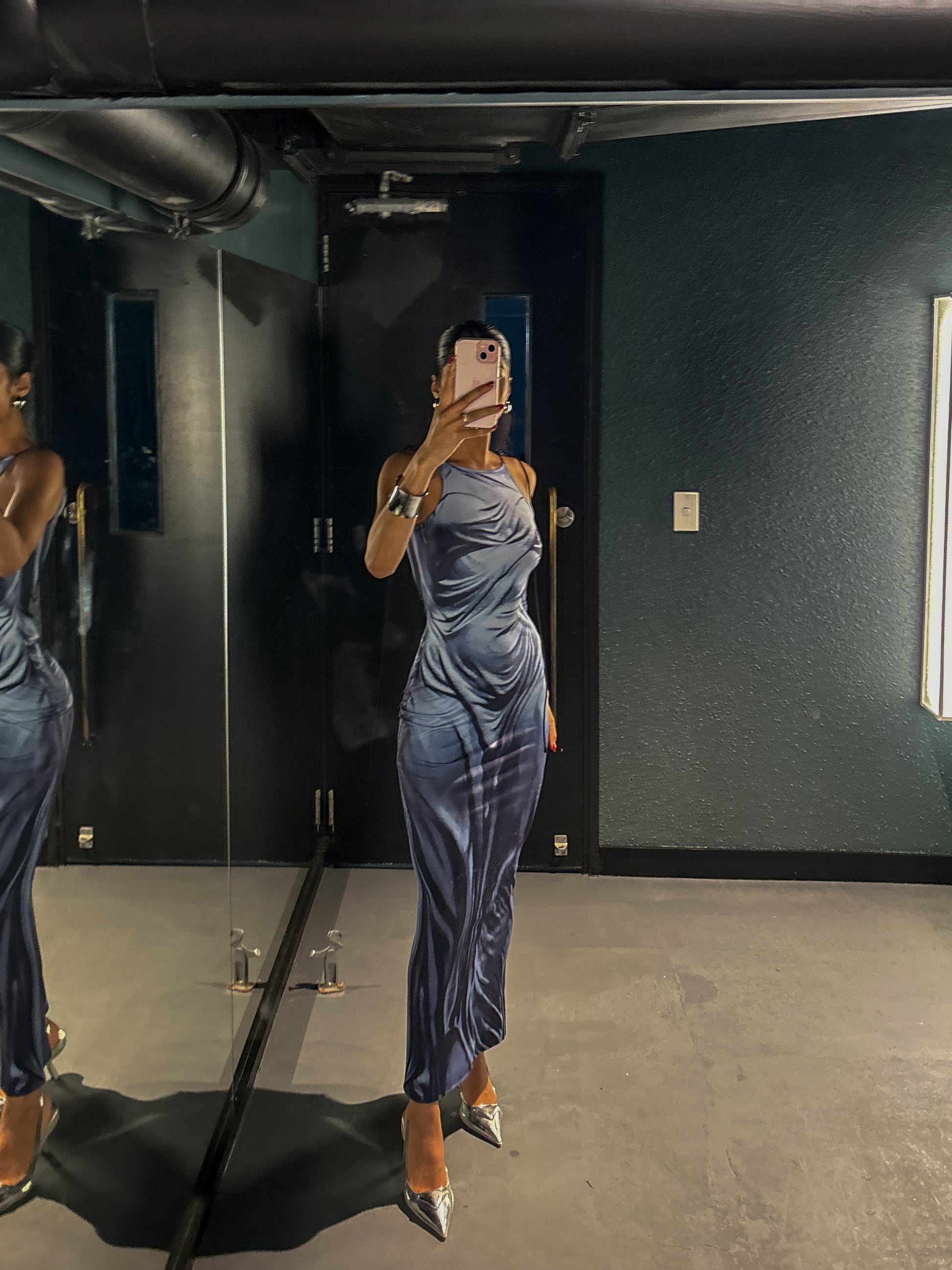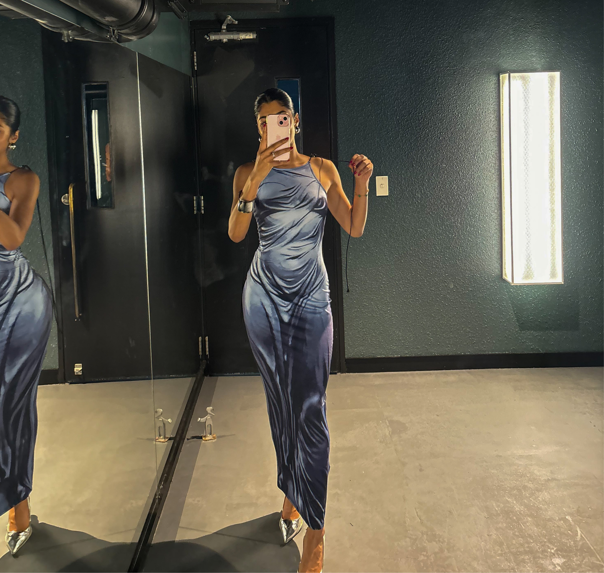 Slip into our Spray On Dress-Blue, one of our most iconic rentals. This unique dress creates the illusion of wearing a wet dress, accentuating your figure. Available in Size Small and Medium, pair it with our silver Prada racerback heels for a stunning look! (Get ready to make a splash on the dance floor!)