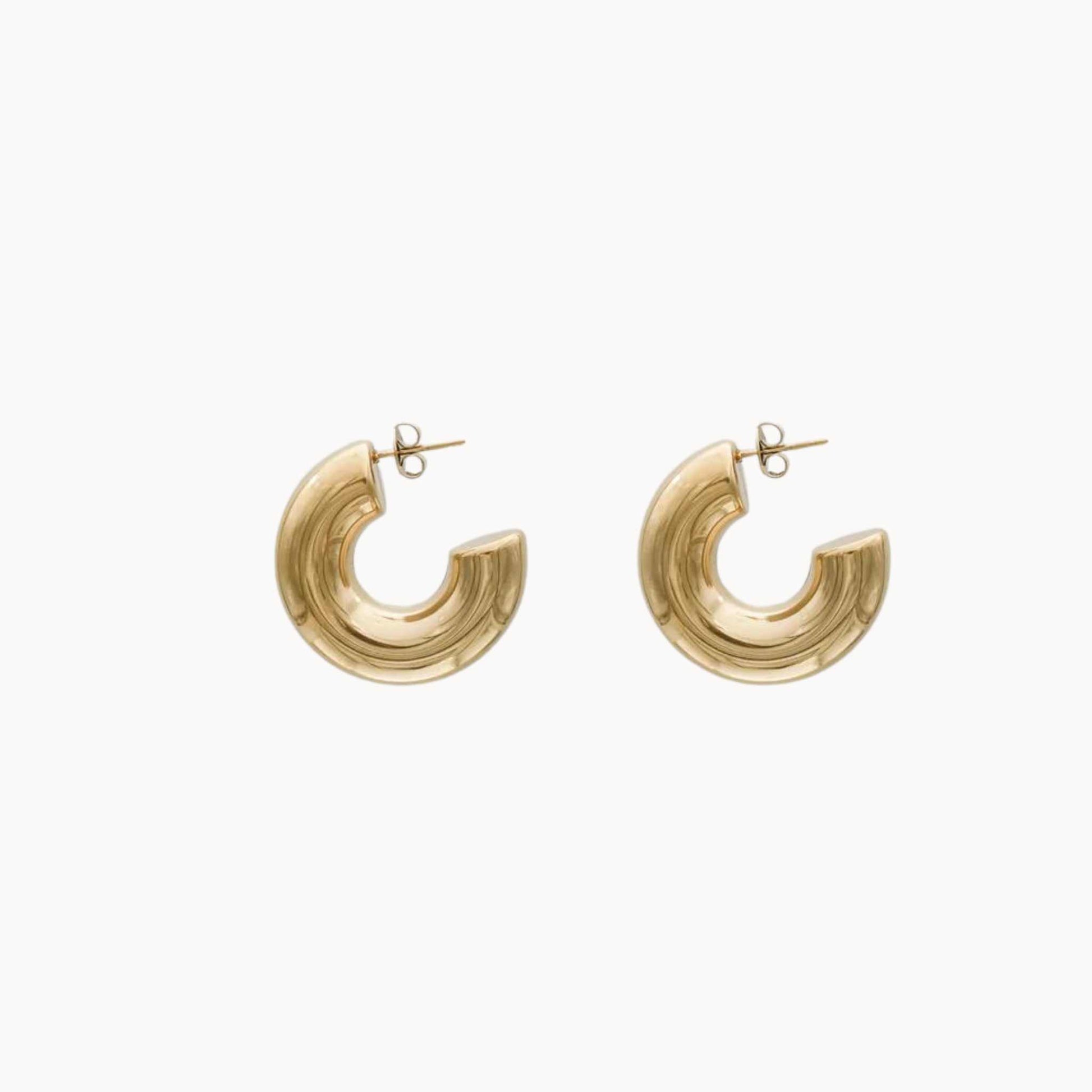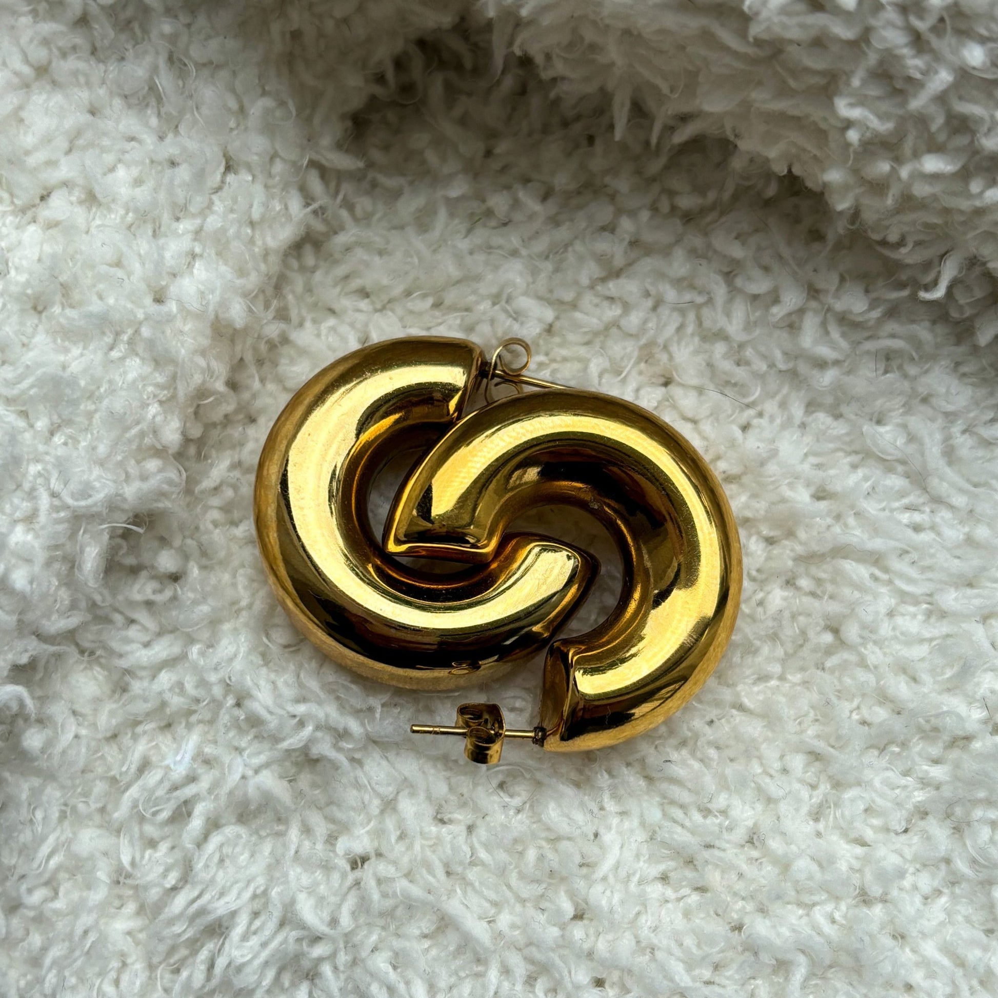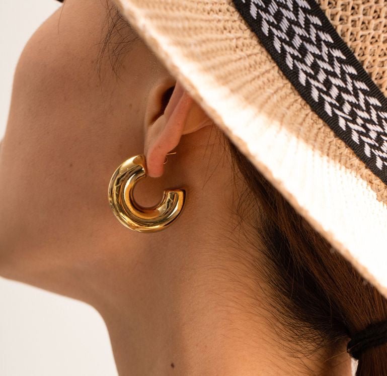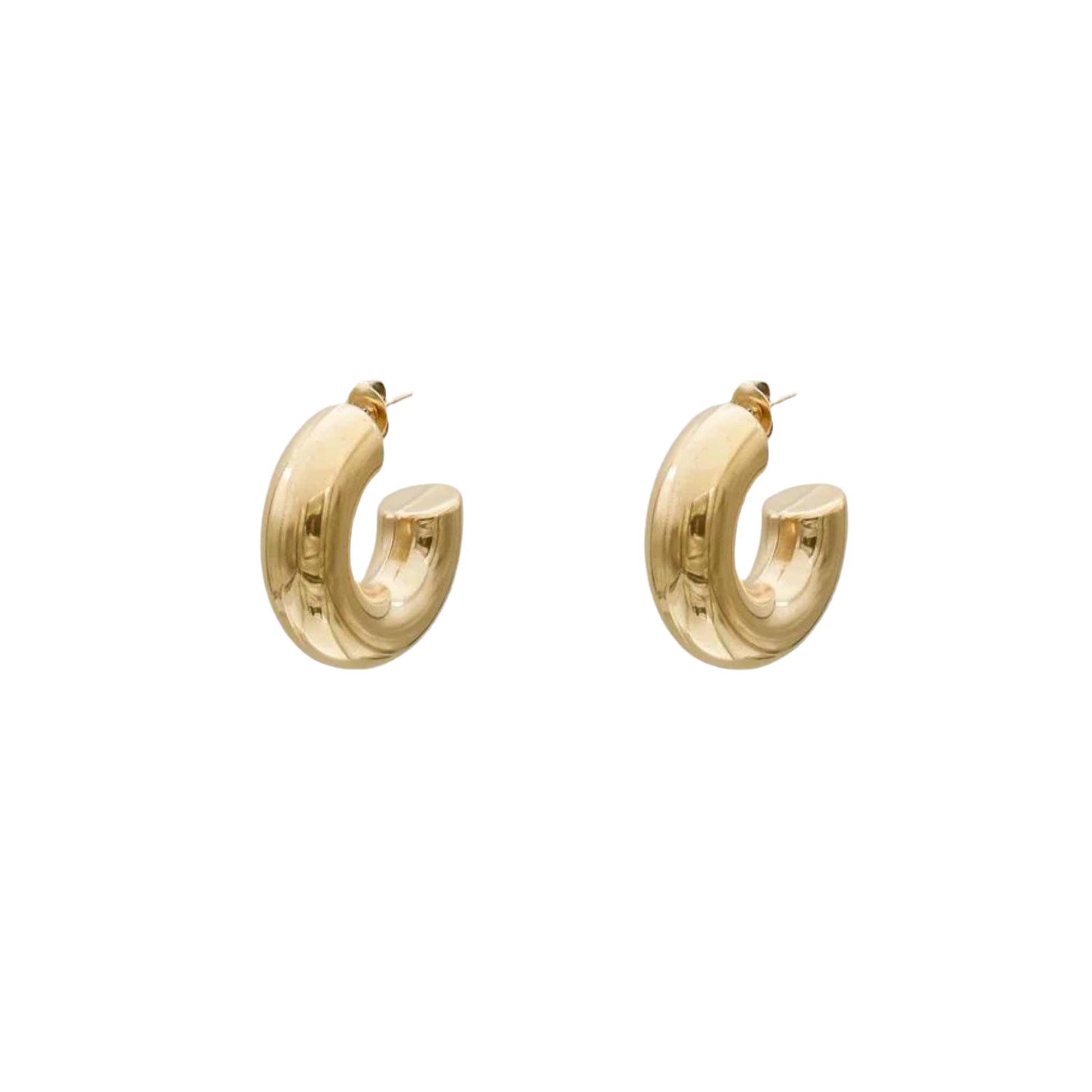 Your new statement hoops have arrived! The Chubby Hoops are a future favourite - playfully hollow and lightweight. These hoops are a bold twist on the classic hoop. Designed for daily wear and perfect for anyone who wants to add that extra sparkle to their outfit. Crafted from the Highest Grade Stainless Steel and finished with a warm, vintage 18K gold coating, they are both lightweight and waterproof, so you can wear them with confidence and never have to take them off! The perfect off duty model hoop. Take any outfit from day to night effortlessly.