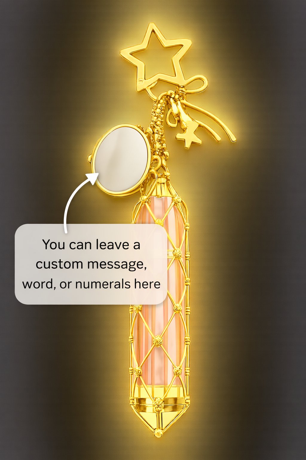 Crafted in gold or silver plating with cute bow and star details, this piece features an optional heart or star-shaped mirror that can be custom engraved with a word, name, reminder, or special numerals.