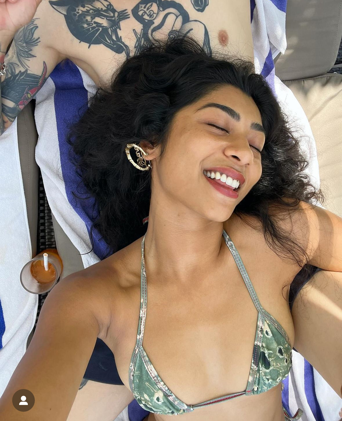 RAGA MALAK Green denim print Bikini Top With Contrast red stitching