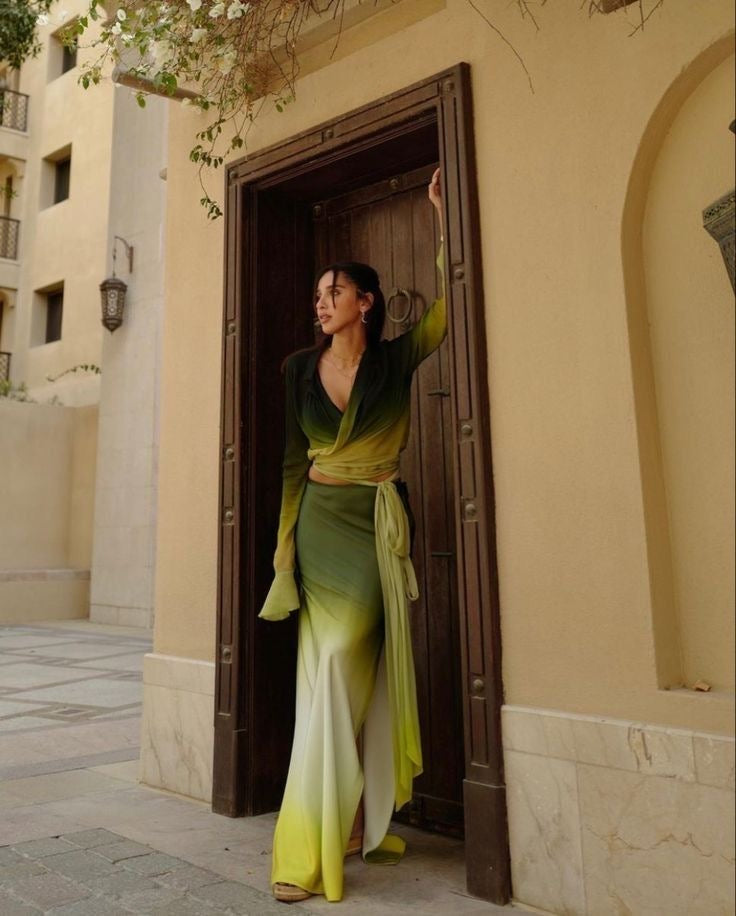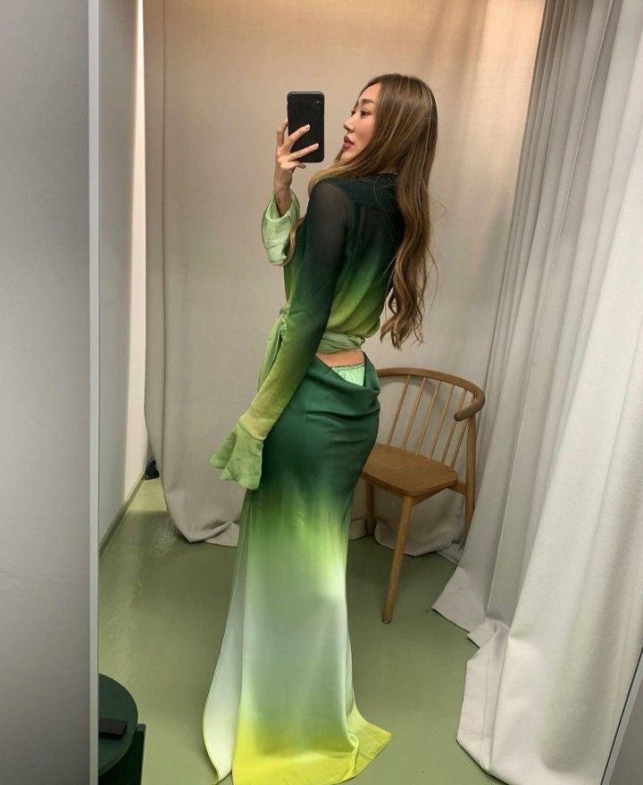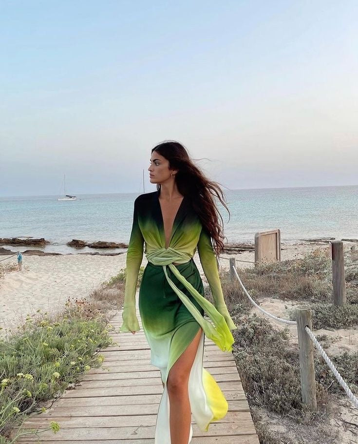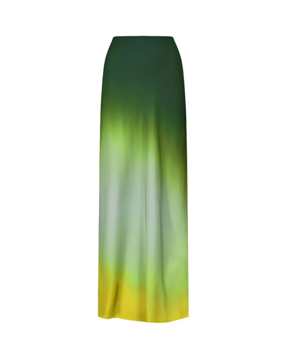 A slinky, floor-sweeping maxi skirt in dip-dyed green, Cypress is a classic nineties shape remixed with a daring cowl back.
