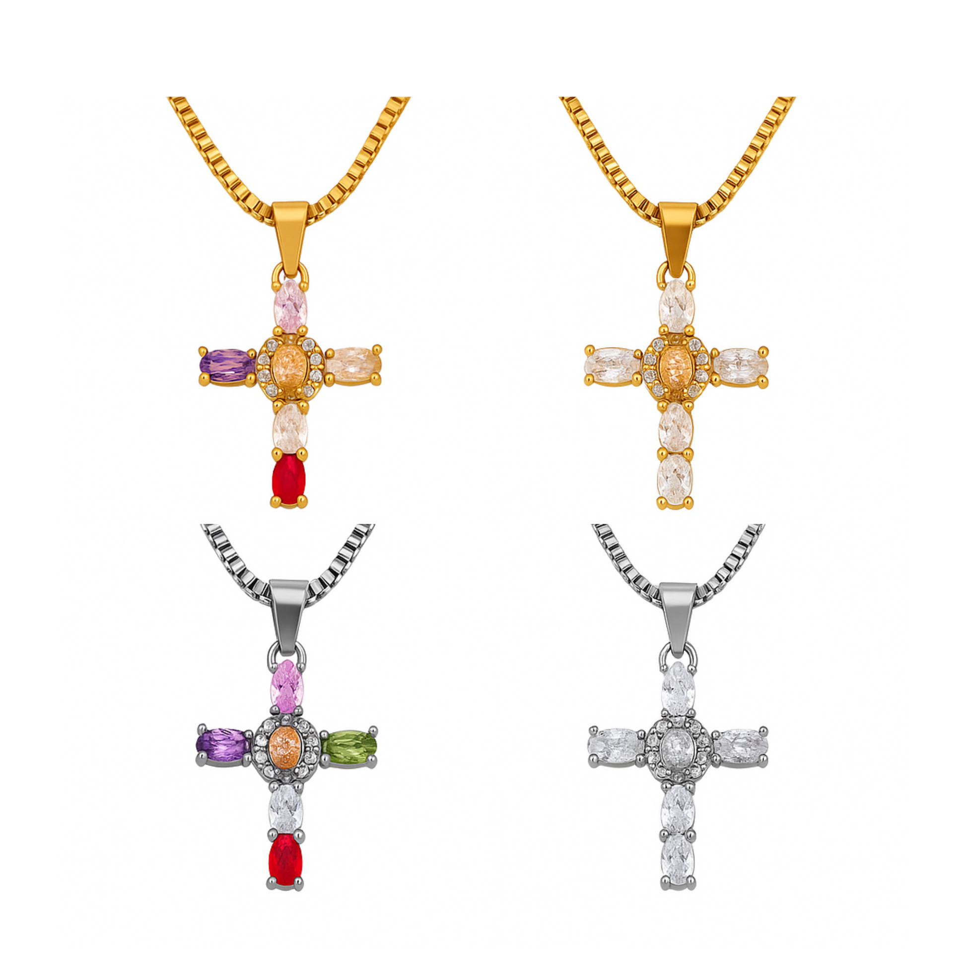Our Multi-Stone Cross Necklace is the ultimate statement-meets-everyday piece — bold enough to stand on its own, yet versatile enough to layer into your favourite necklace stack. The sculptural cross pendant is set with vibrant, glistening stones that catch the light from every angle, giving you that fun, sexy, and effortlessly put-together vibe.