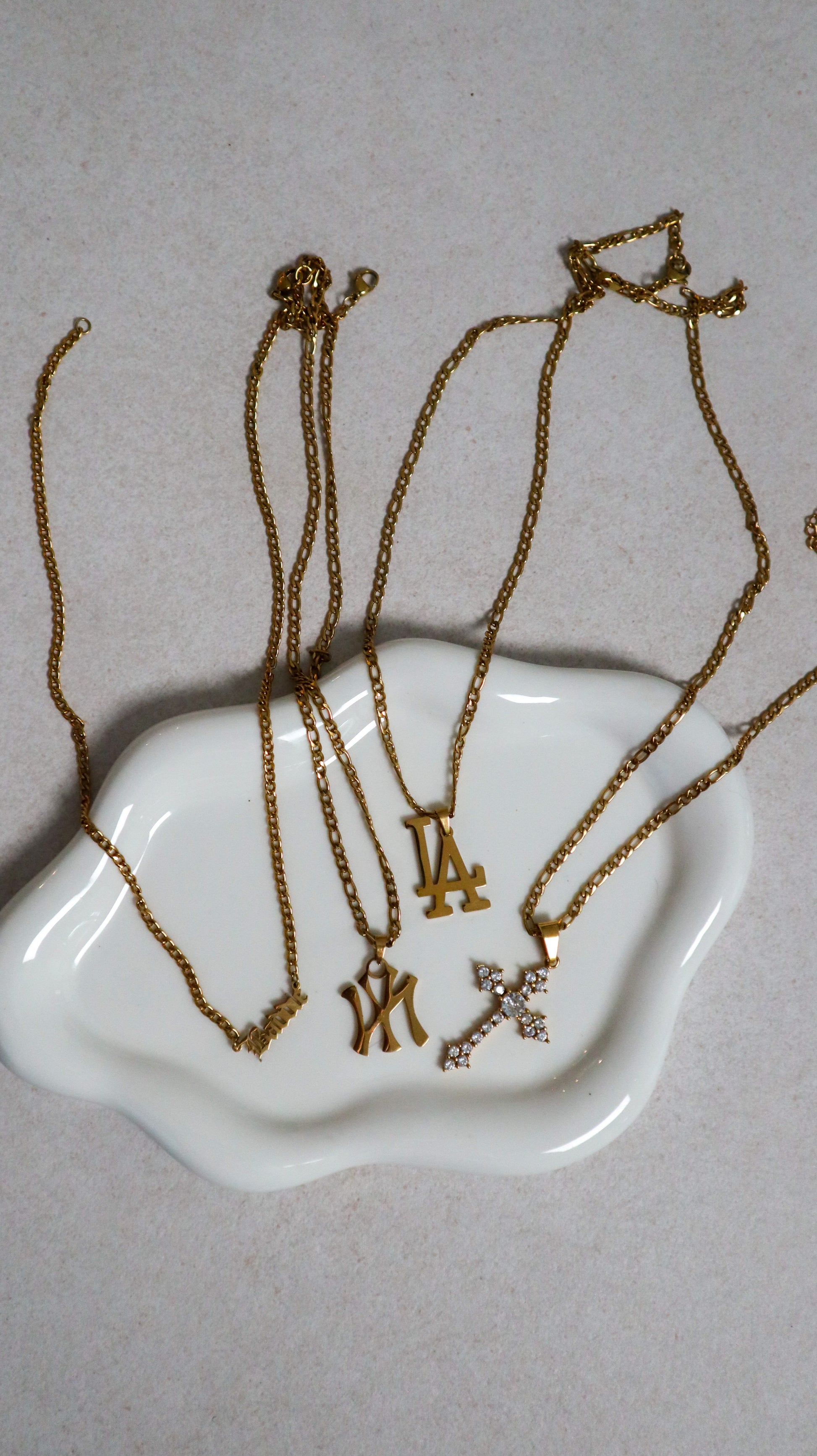 lo Introducing our West Coast Chain, inspired by our popular NY Yankee Necklace. Made with 18K Gold plated stainless steel, this tarnish-free and waterproof piece is available in silver. Featuring a 3mm figaro chain, perfect for wearing alone or layering. Expertly crafted for a stylish addition to any outfit.